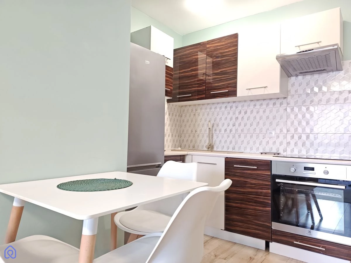 Wnętrze jest jasne i nowocześnie wykończone. Kuchnia stanowi spójną zabudowę z kompletem sprzętów, a salon jest ustawny i funkcjonalny. Mieszkanie jest gotowe do zamieszkania bez dodatkowych nakładów.