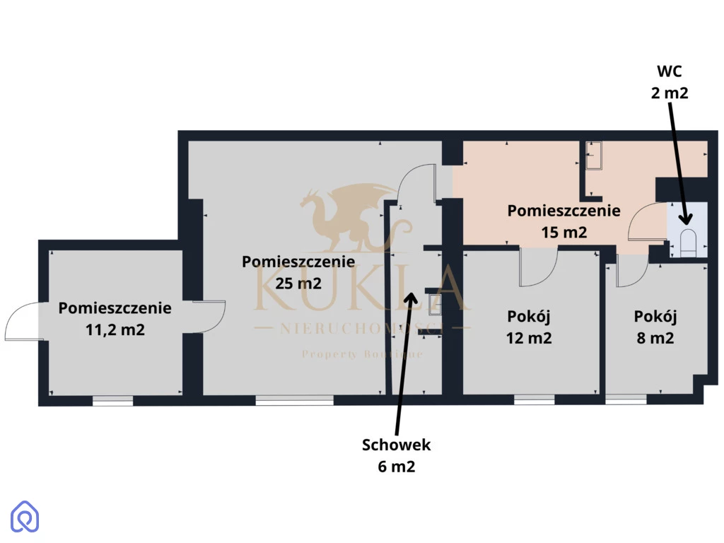 Nieruchomość: Lokal składa się z trzech dużych przechodnich pomieszczeń, schowka z doprowadzoną wodą i elektryką, dwóch pokoi, toaleta, kuchnia.