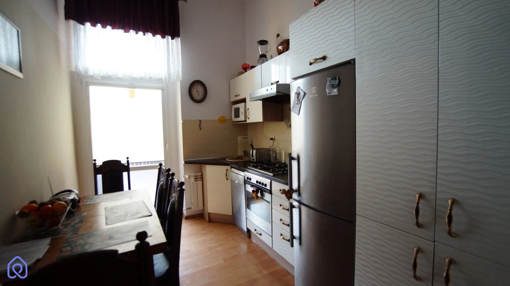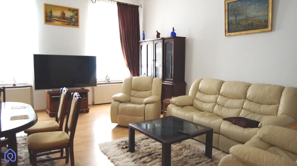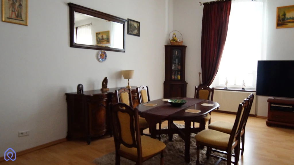 Mieszkanie w standardzie do odświeżenia, składa się z 4 dużych pokoi, widnej kuchni z wyjściem na taras, łazienki z wc, osobno wc oraz dużego przedpokoju. Lokal posiada kominek. Rozkład i wielkość pomieszczeń stwarza szerokie możliwości adaptacyjne i aranżacyjne. Media: ogrzewanie i ciepła woda - dwu funkcyjny piec gazowy.