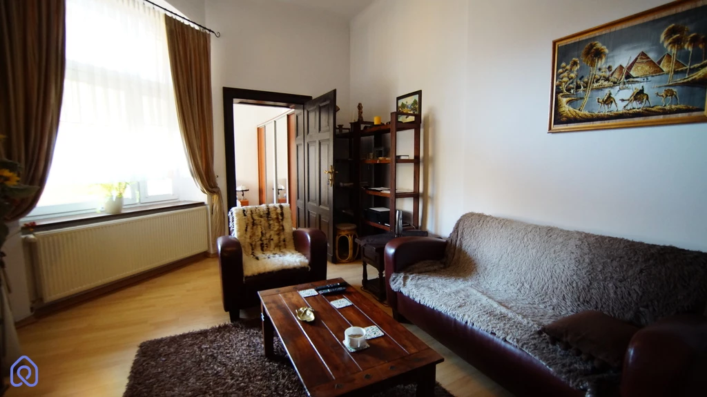 Mieszkanie w standardzie do odświeżenia, składa się z 4 dużych pokoi, widnej kuchni z wyjściem na taras, łazienki z wc, osobno wc oraz dużego przedpokoju. Lokal posiada kominek. Rozkład i wielkość pomieszczeń stwarza szerokie możliwości adaptacyjne i aranżacyjne. Media: ogrzewanie i ciepła woda - dwu funkcyjny piec gazowy.
