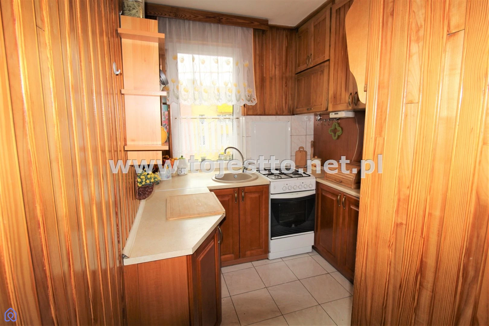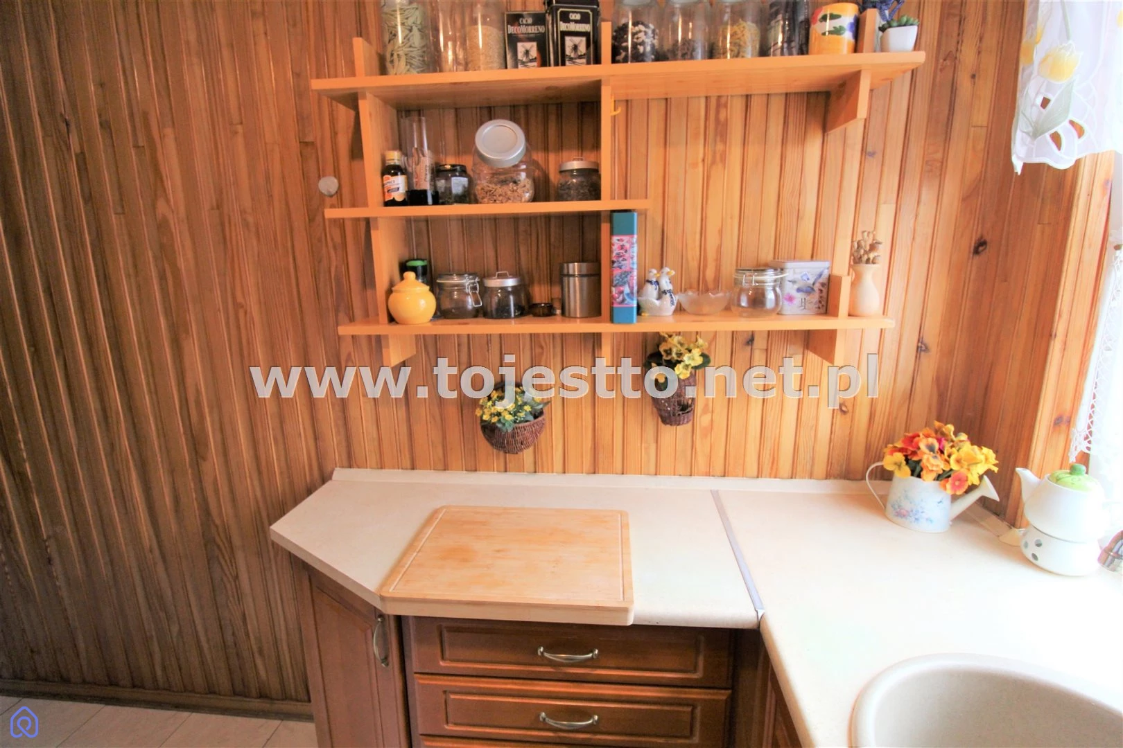 kuchnia powierzchnia około 5,30m2, na podłodze terakota w jasnym kolorze, na ścianach glazura i boazeria, szafki kuchenne naturalne drewniane, zabudowa kuchenna przemyślana i praktyczna