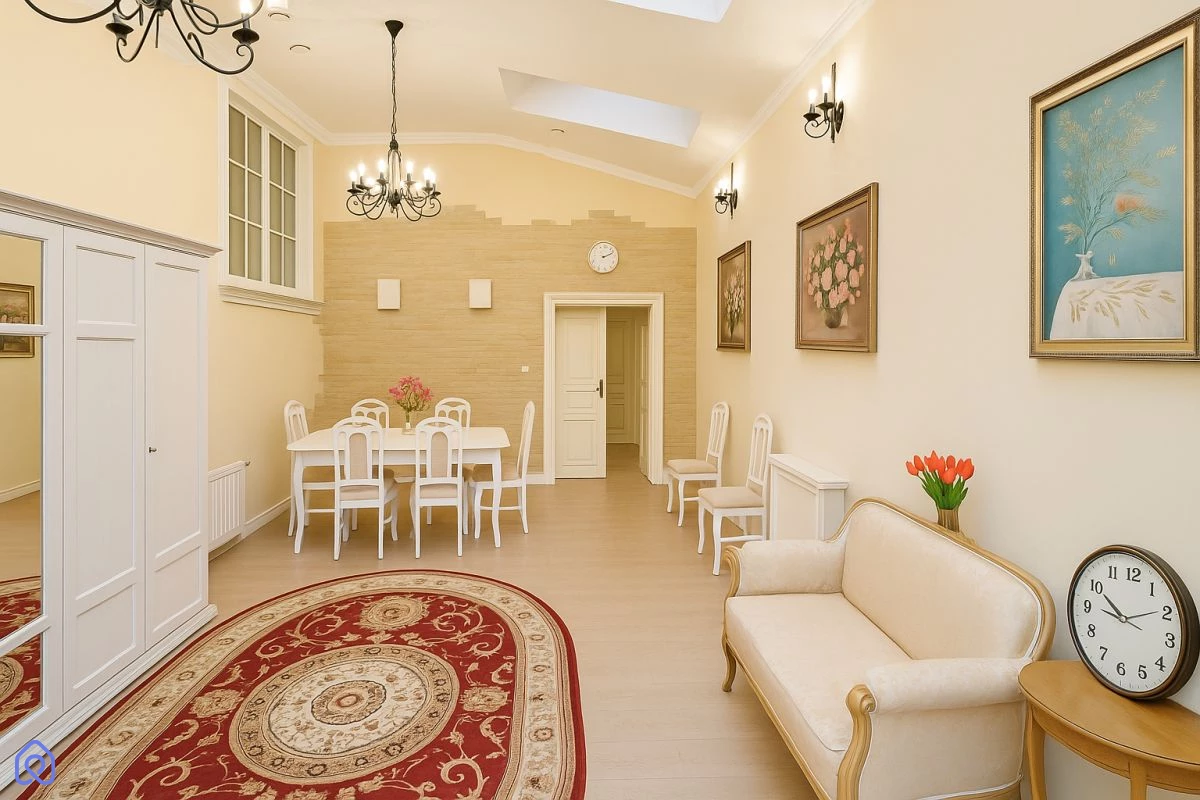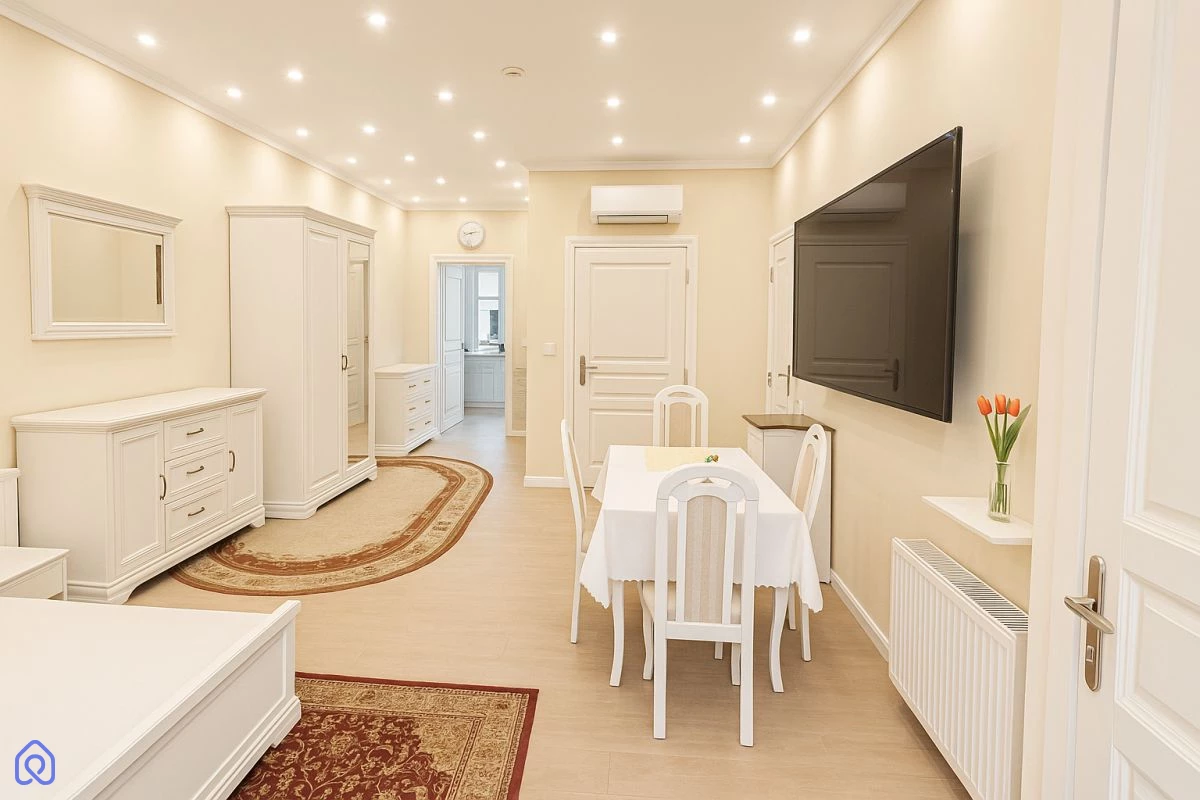 - zlokalizowane na wysokości pierwszego piętra znajduje się duże przylegające mieszkanie 2 pokoje z osobną kuchnią i łazienką. To klimatyzowany apartament o powierzchni około 120m2 o wysokim standardzie. Mieszkanie posiada osobny podjazd i osobne wejście z dwóch stron.