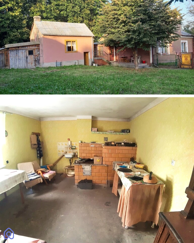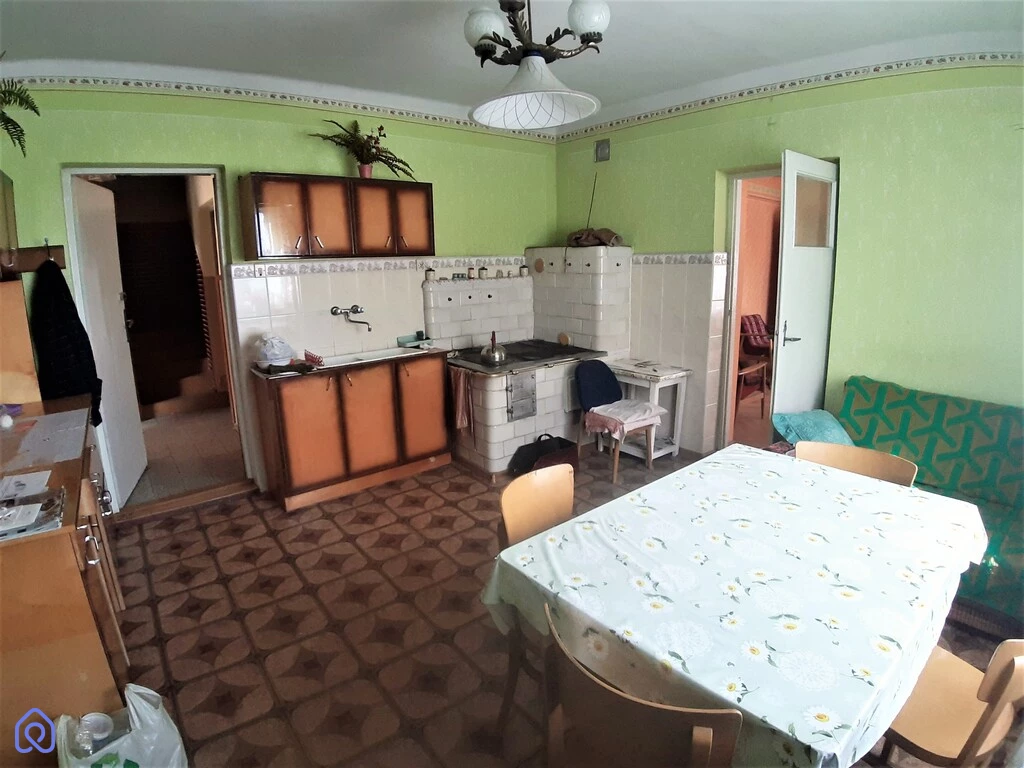 Dom ogrzewany jest z tzw. podkowy w piecu kaflowym w kuchni i przez 2 grzejniki c.o. w pokojach.