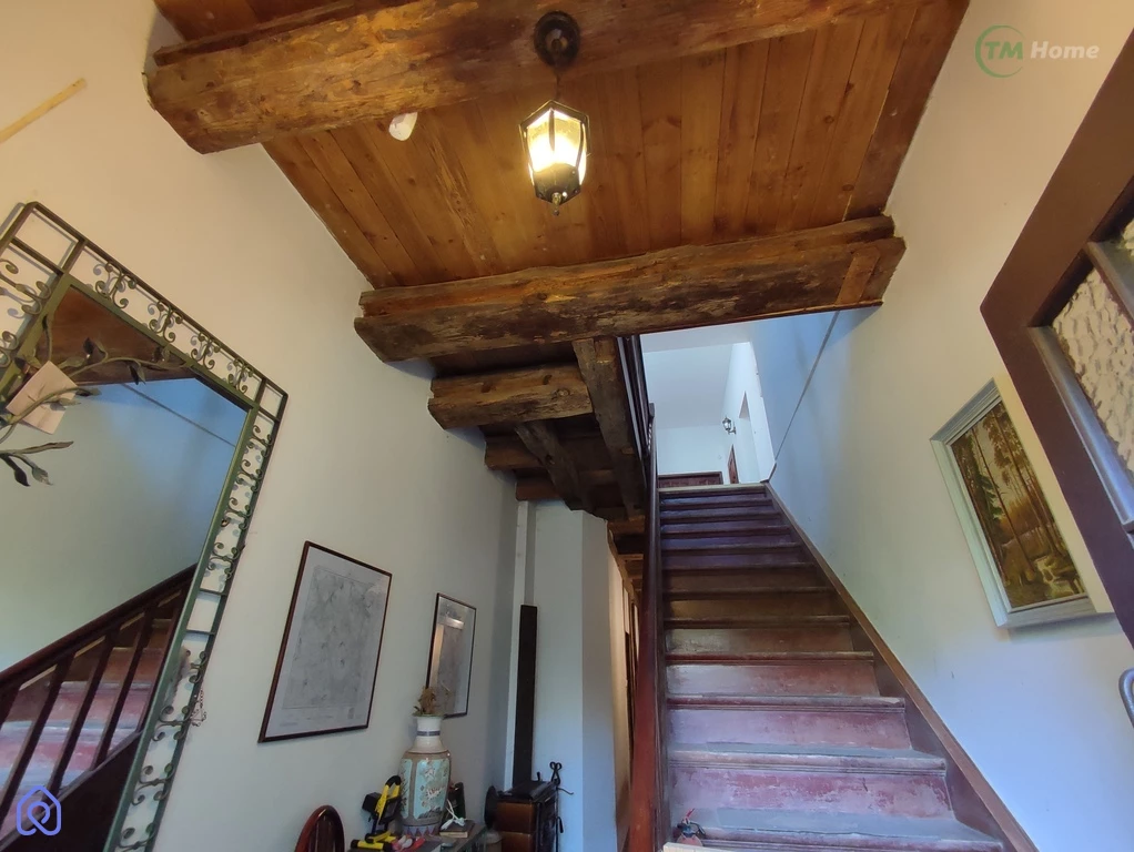 - pokój dzienny z aneksem kuchennym i łazienką, korytarz, z którego na piętro prowadzą drewniane schody zachowane w dawnym stylu.