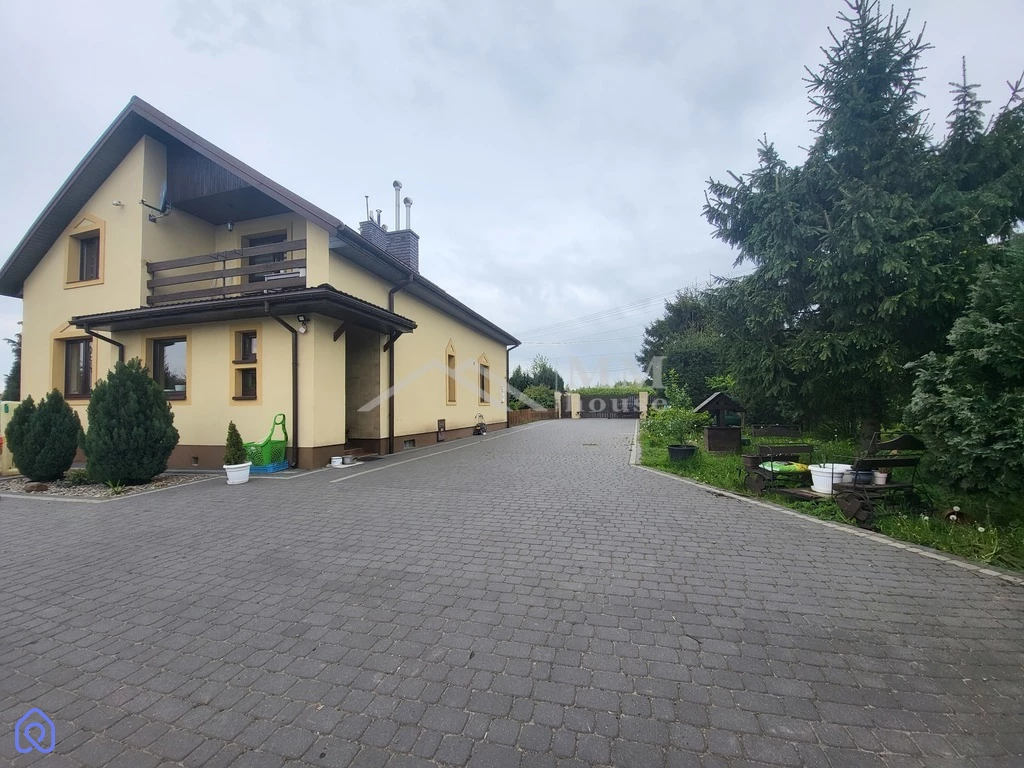Garaż z trzema bramami wjazdowymi o dużych gabarytach, z których jeden może nawet pomieścić samochód ciężarowy. Automatyczna brama wjazdowa prowadzi nas podjazdem z kostki brukowej do garaży oraz tylnej, odsłoniętej od drogi, części działki.