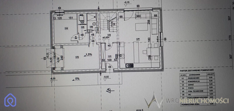 Parter: przestronny salon z kuchnią, dodatkowy pokój, łazienka, garaż wbudowany w budynek oraz kotłownia.