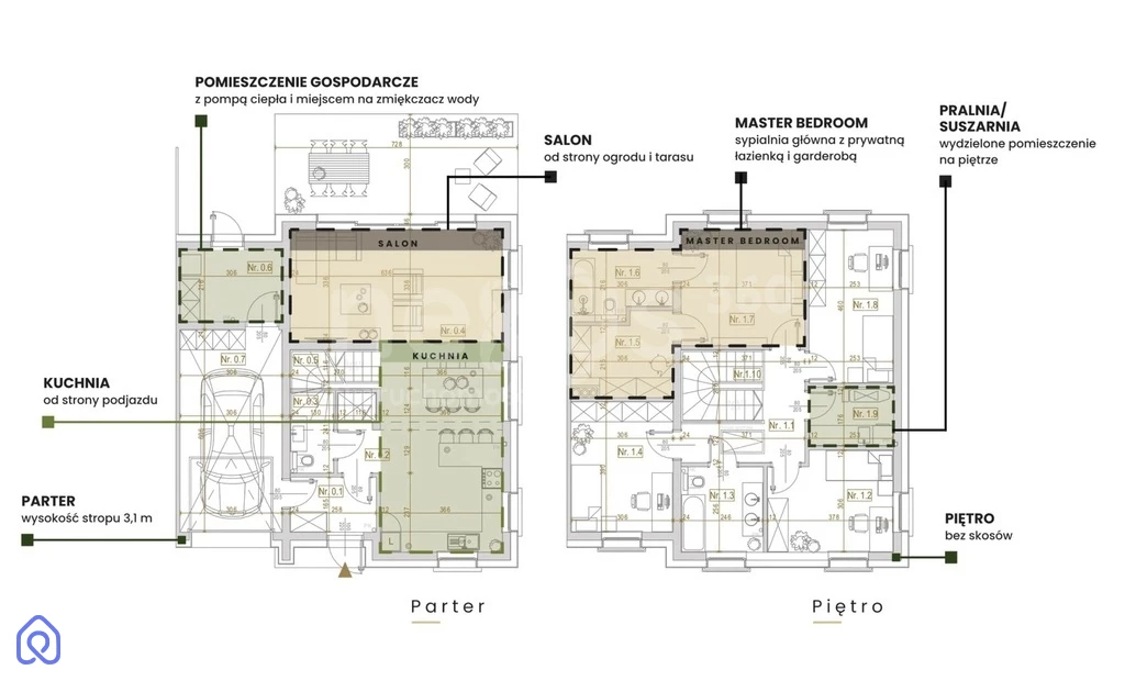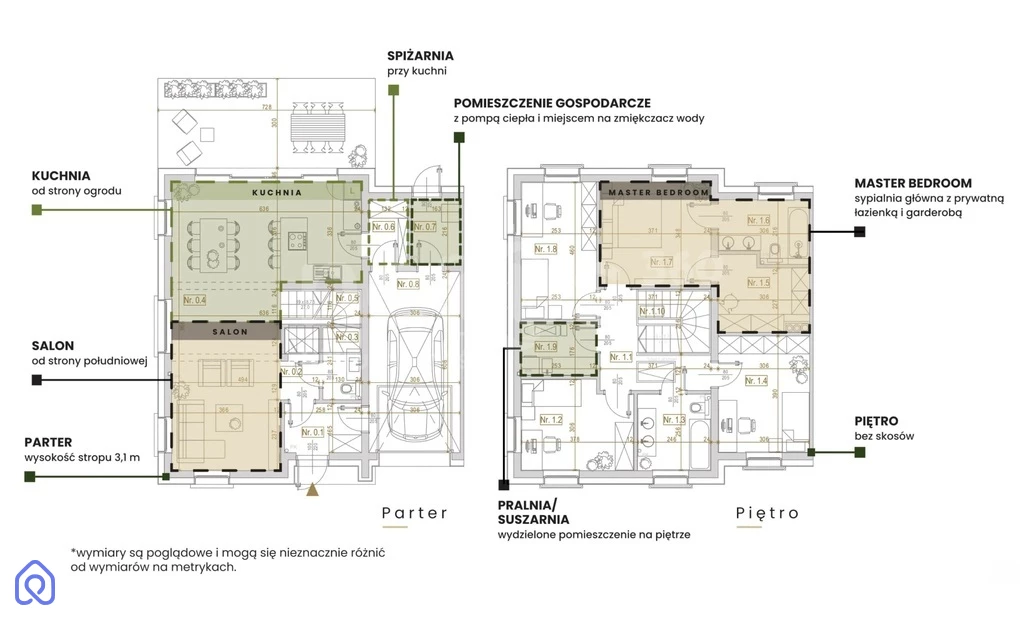 - garaż o pow. 18m2 w bryle budynku i dodatkowo 2 miejsca postojowe przed domem