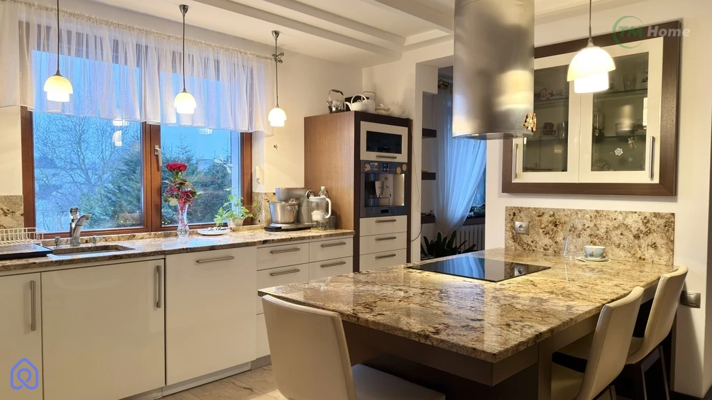 Sercem nieruchomości jest reprezentacyjna strefa dzienna -jasny imponujący salon z dużymi przeszkleniami zapewniają doskonałe doświetlenie i piękne widoki na zieleń, wyjściem na taras oraz kominkiem , który nadaje wnętrzu wyjątkowego charakteru.