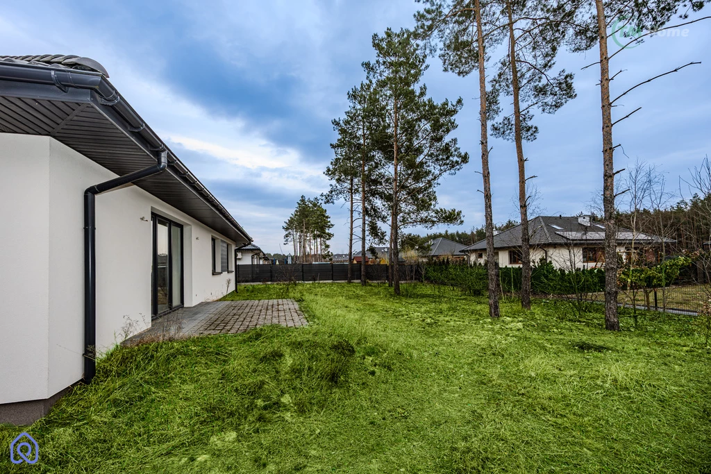 Dom zbudowany narożnej działce z ogrodem w cieniu wysokich sosen.