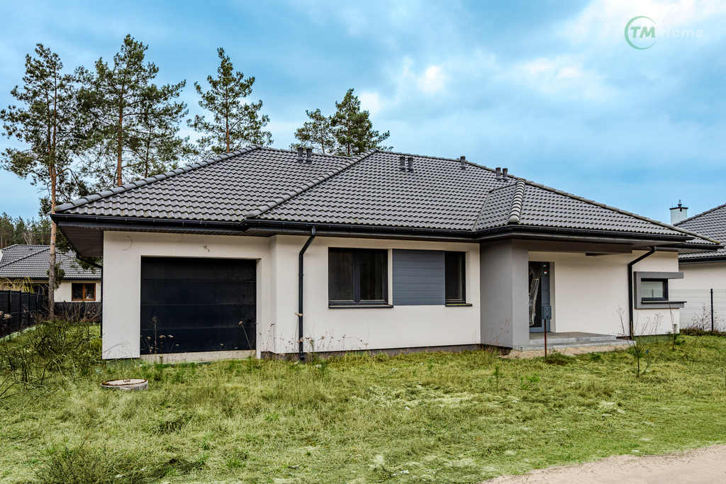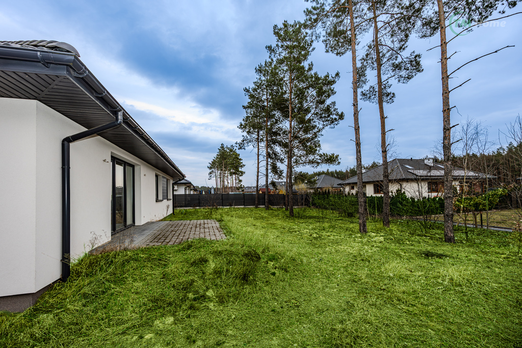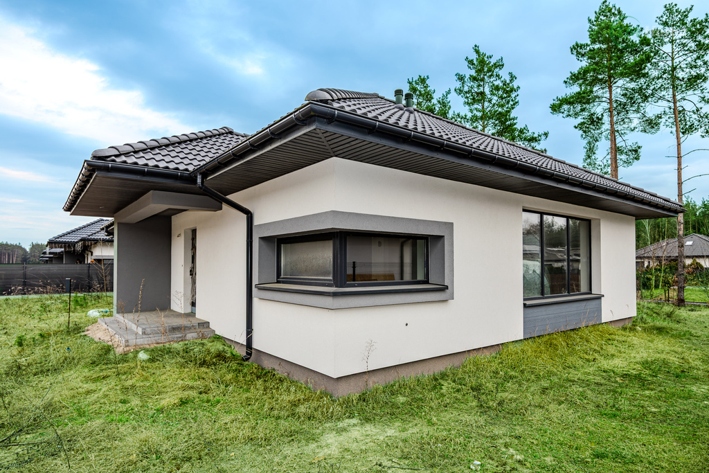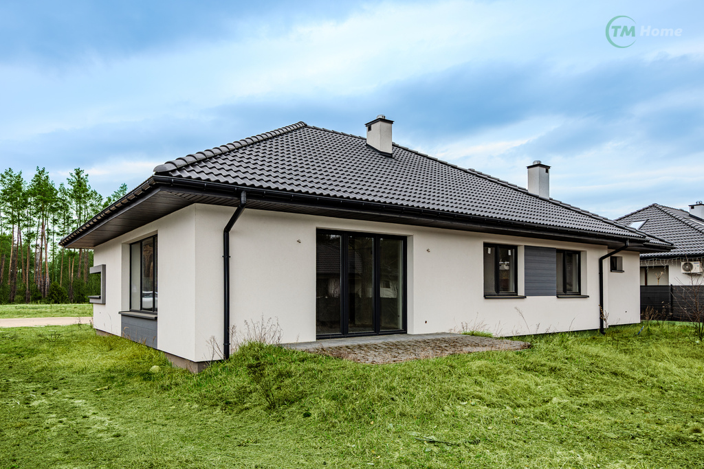 Dom zbudowany narożnej działce z ogrodem w cieniu wysokich sosen.