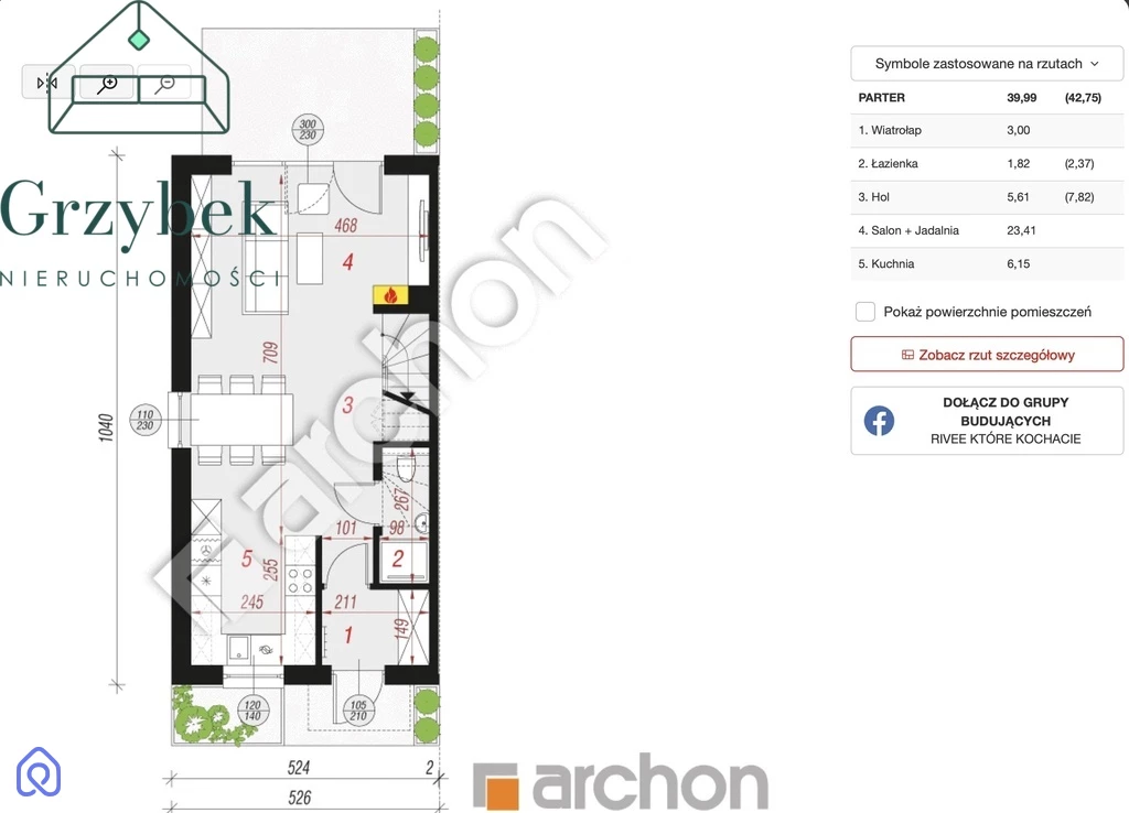 parter : wiatrołap, hol, łazienka, salon z jadalnią, kuchnia