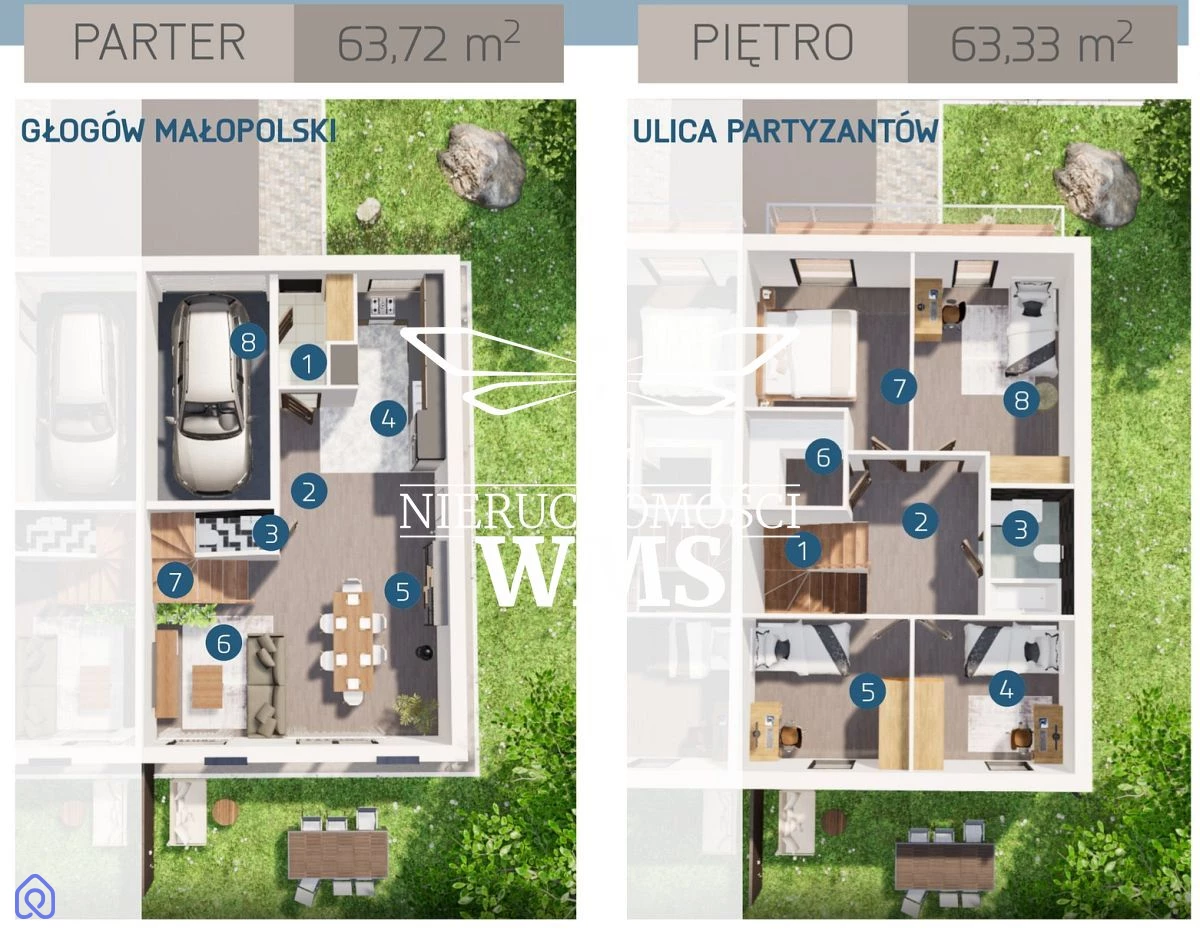 W ofercie Biura Nieruchomości WMS na sprzedaż dom w zabudowie bliźniaczej w stanie deweloperskim o numerze B10/M20 Powierzchnia domu to 127,05 m2 - powierzchnia ogródka 201,24m2 W skład nieruchomości wchodzi: Partner: - Wiatrołap - Korytarz - Toaleta - Kuchnia - Jadalnia - Salon - Klatka schodowa Pietro: - Korytarz Łazienka - 3 pokoje - Garderoba - Sypialnia Dom zasilany pompą ciepła - jest w pełni ekologiczny a zarazem ekonomiczny w użytkowaniu. Przewidywany termin oddania I kwartał 2026 roku NIE PŁACISZ PODATKU PCC 2% W ofercie 11 lokali lewostronny oraz 11 lokali prawostronnych z rożnej wielkości areałem ogrodu - sprawdź pozostałą ofertę i wybierz coś idealnego dla siebie!!! Zadzwoń i umów się na prezentację. Katarzyna Koryl tel:885 025 377 e-mail: kkoryl@nieruchomosciwms.pl NIERUCHOMOŚCI WMS tel. 606 106 968 www.nieruchomosciwms.pl biuro@nieruchomosciwms.pl Zapraszamy do zapoznania się z wyjątkową ofertą sprzedaży nowo powstałych domów jednorodzinnych w zabudowie bliźniaczej. Usytuowane w malowniczej i dynamicznie rozwijającej się lokalizacji Głogowa Małopolskiego, oferują idealne połączenie komfortu życia z doskonałą komunikacją miejską. Dzięki bliskości przystanków autobusowych, kolei podmiejskiej oraz szybkiemu dostępowi do autostrad i trasy S19, dojazd do Rzeszowa oraz pobliskich stref przemysłowych w Rogoźnicy i Jasionce jest niezwykle sprawny i szybki. Nowoczesna inwestycja obejmuje domy o powierzchni użytkowej 127 m2, które zostały zaprojektowane z myślą o wymagających klientach szukających przestrzeni i wygody. Każdy z pięciu pokoi rozlokowanych na dwóch kondygnacjach zapewnia funkcjonalność i swobodę aranżacji wnętrz. Budynki powstają z użyciem wysokiej klasy materiałów, takich jak pustak, a ich dachy pokryte są estetyczną dachówką. Budynki wyposażone są w innowacyjne rozwiązania, jak pompa ciepła, która gwarantuje efektywne ogrzewanie przy minimalnych kosztach eksploatacji. Położenie w pobliżu sklepów (Lidl, Biedronka, Stokrotka), placówek edukacyjnych (szkoła podstawowa, liceum), przedszkoli, żłobków, ośrodków zdrowia oraz atrakcji rekreacyjnych, takich jak stadnina koni, siłownia, basen i kort tenisowy, czyni tę ofertę jeszcze bardziej atrakcyjną. Bliskość lasów stwarza doskonałe warunki do aktywnego wypoczynku i obcowania z naturą, co z pewnością docenią miłośnicy spędzania czasu na świeżym powietrzu. Domy dostępne są w stanie deweloperskim, co pozwala na aranżację wnętrz zgodnie z indywidualnymi potrzebami i preferencjami. Garaż w bryle budynku oraz działka o powierzchni od 79,24 m2 do 450 m2 z ogrodzeniem z siatki, a także utwardzona droga dojazdowa, stanowią o dodatkowym komforcie użytkowania tej nieruchomości. Planujemy zakończenie budowy na rok 2026, a pierwsze domy będą dostępne już od 2025 roku. Zapraszamy do kontaktu w celu uzyskania bliższych informacji i umówienia się na prezentację tej unikalnej inwestycji. Niniejsze ogłoszenie nie stanowi oferty w rozumieniu przepisów Kodeksu Cywilnego oraz innych właściwych przepisów prawnych, a dane w niej zawarte mają jedynie charakter informacyjny.