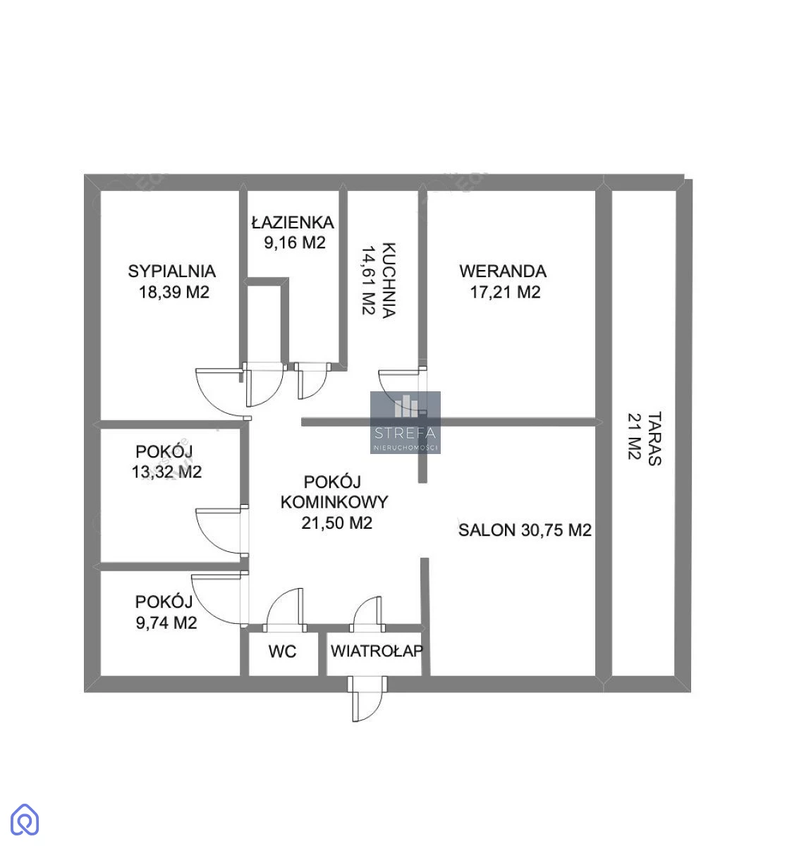wiatrołap - 3,02 m2 salon - 30,75 m2 pokój z kominkiem - 21,50 m2 weranda - 17,21 m2 toaleta - 2,61 m2 pokój - 9,74 m2 pokój - 13,32 m2 sypialnia - 18,39 m2 łazienka - 9,16 m2 kuchnia - 14,61 m2 komunikacja - 4,4 m2 taras - 21 m2