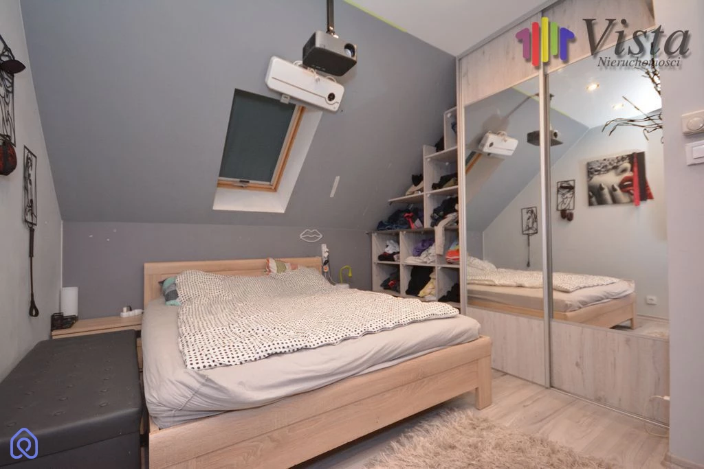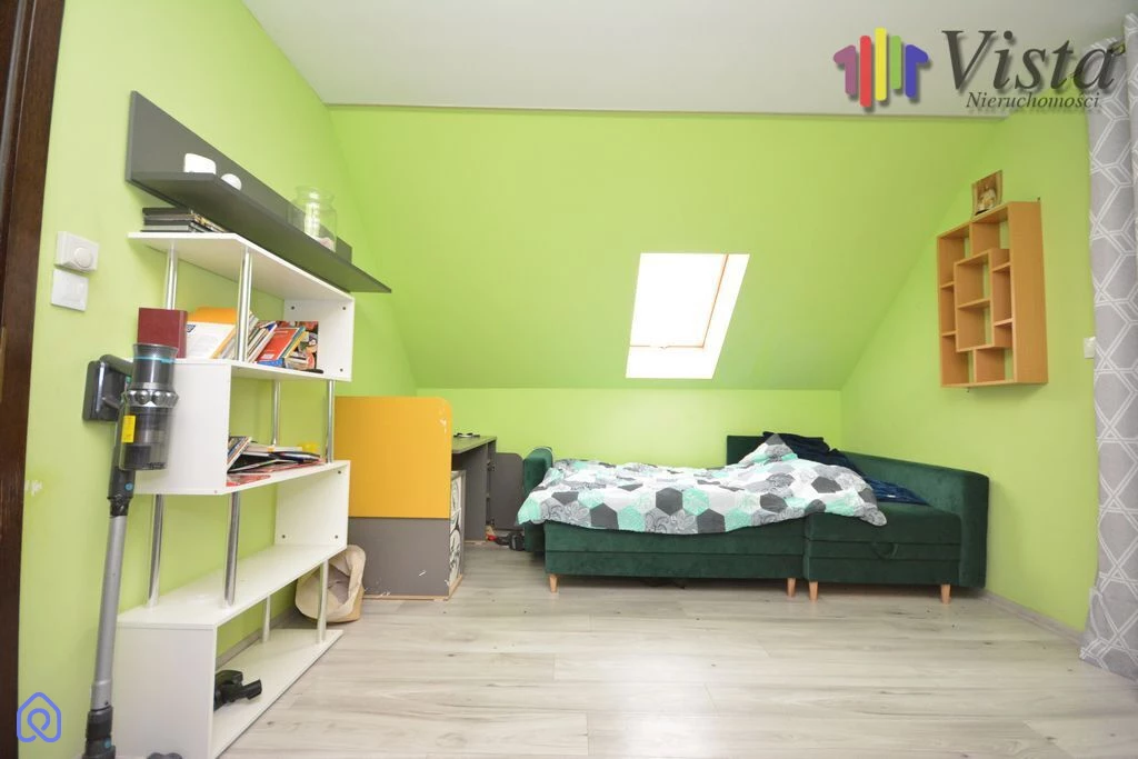 Piętro oferuje sypialnie — łącznie 4 pokoje (w tym główna sypialnia z możliwością garderoby) i druga łazienka, co zapewnia komfort dużej rodzinie lub gościom. Układ pomieszczeń daje możliwość aranżacji gabinetu, pokoju hobby lub pokoju dla dzieci.