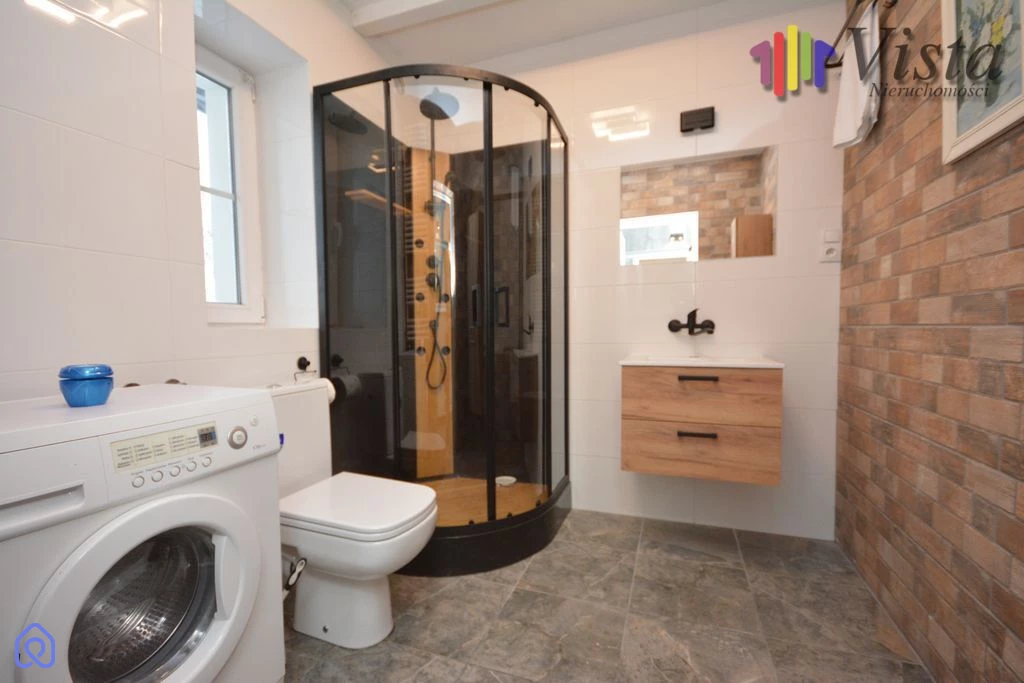 Na pierwszej kondygnacji zaraz przy schodach usytuowana jest też ładna łazienka z kabiną prysznicową oraz WC.