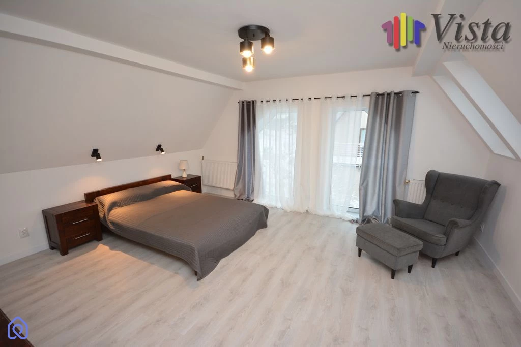Schody na piętro prowadzą do dwóch sypialni. Jednej z balkonem , drugiej większej ,