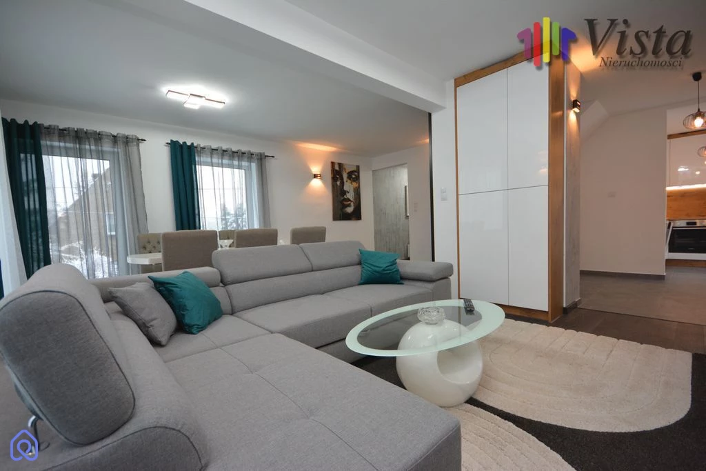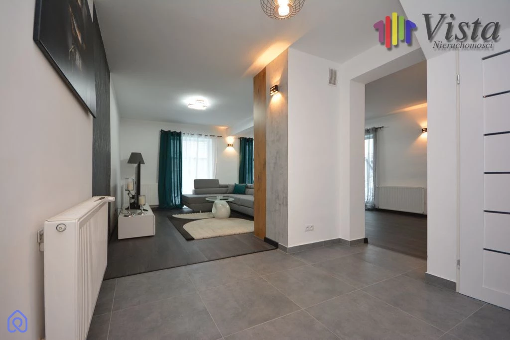 Nieruchomość składa się z 3 kondygnacji . 0-piwnicy , kolejna kondygnacja to przedpokój z którego wchodzi się do dużego salonu gdzie mieści się narożnik , stół z krzesłami.