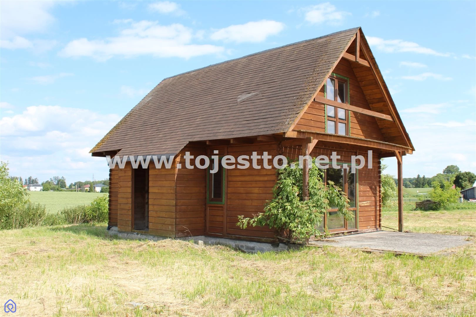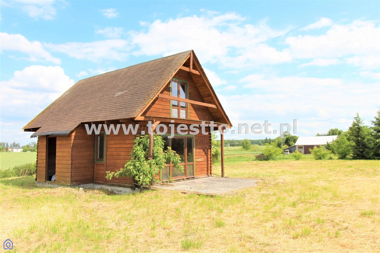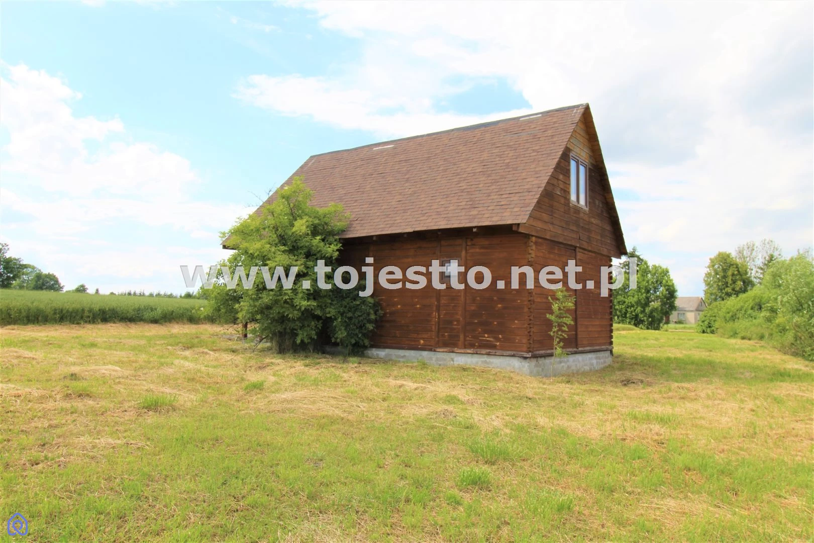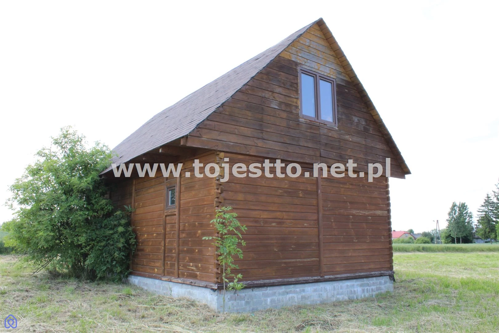 oferuje na sprzedaż drewniany parterowy domek z użytkowym poddaszem w stanie surowym zamkniętym na działce o powierzchni 2500m2