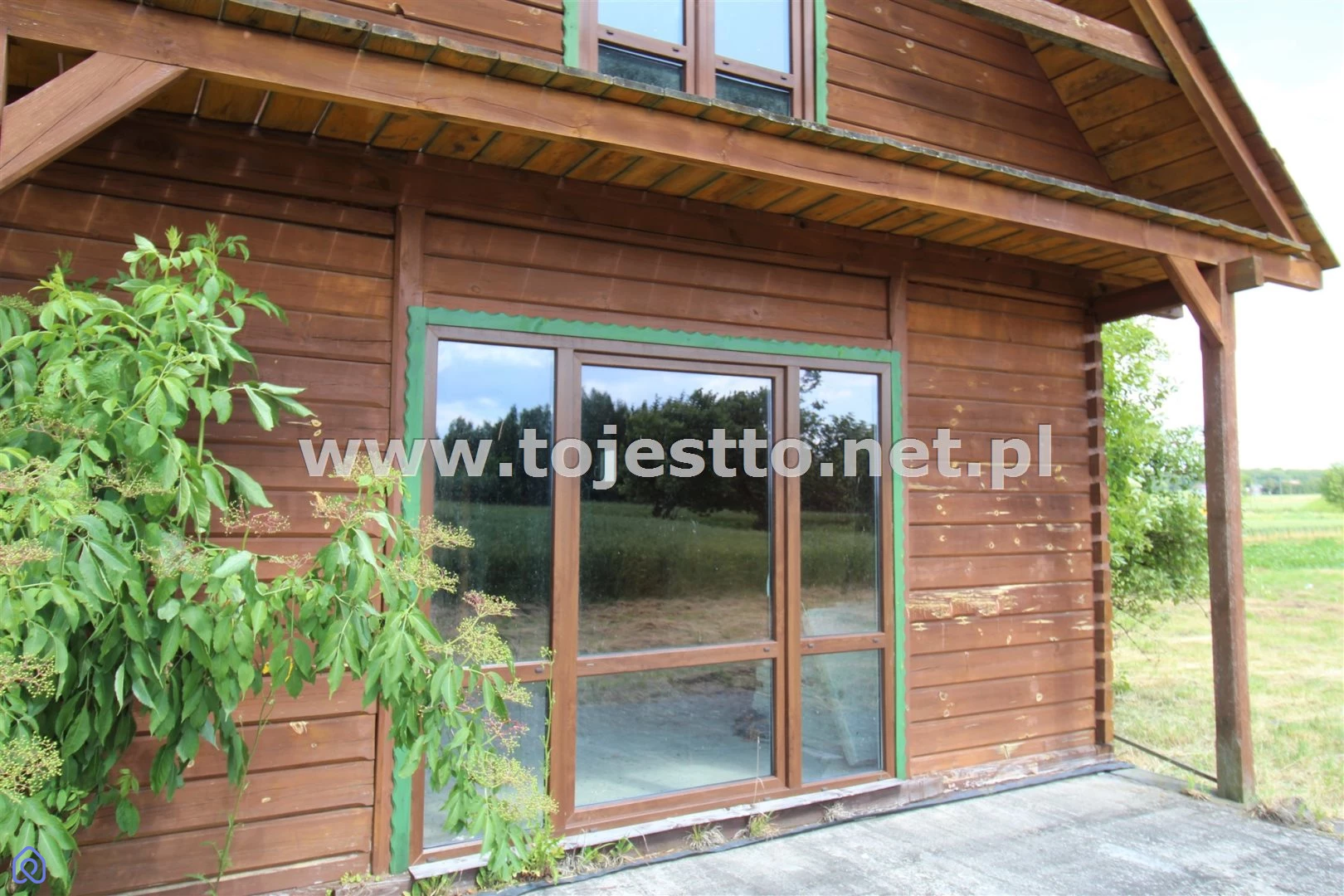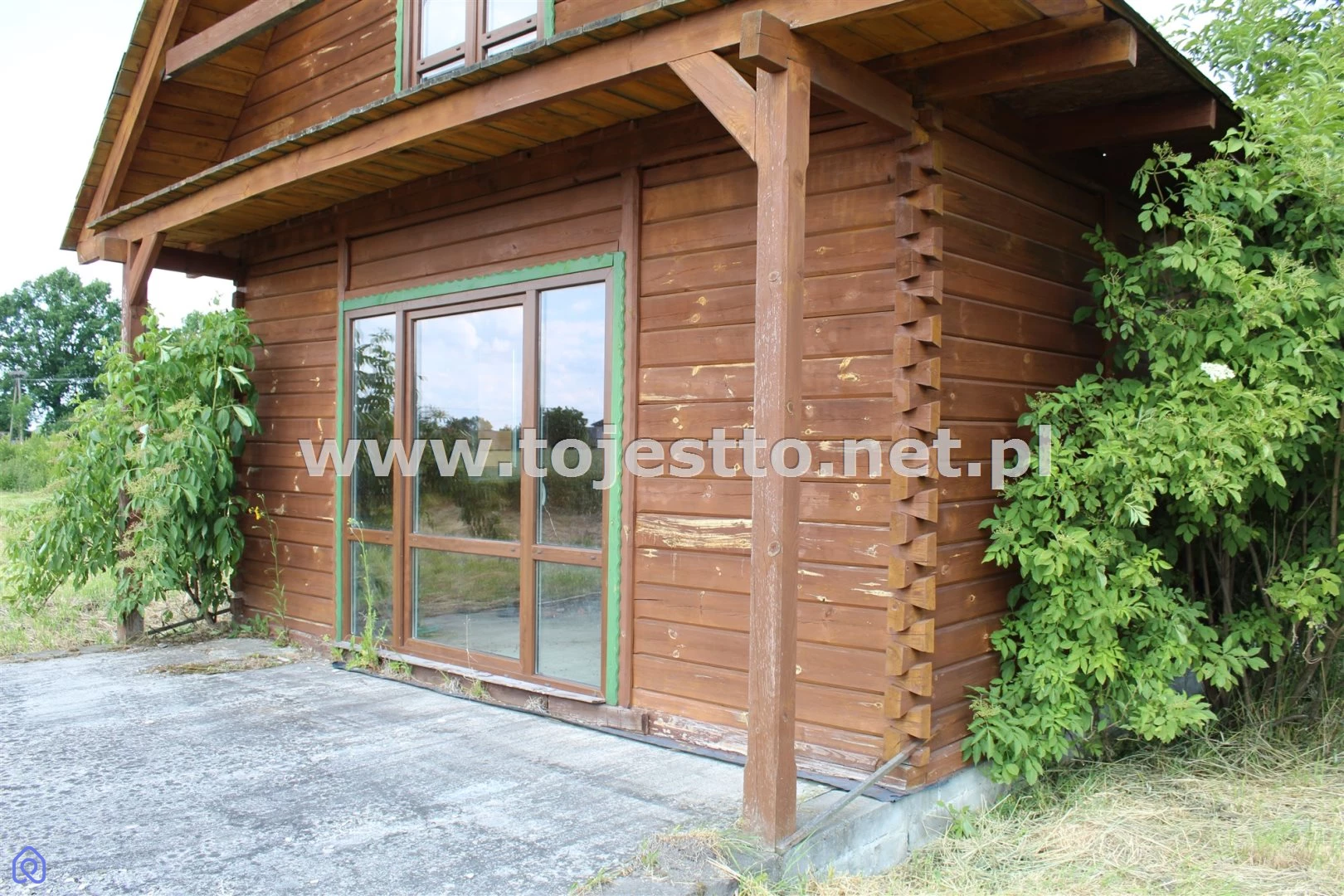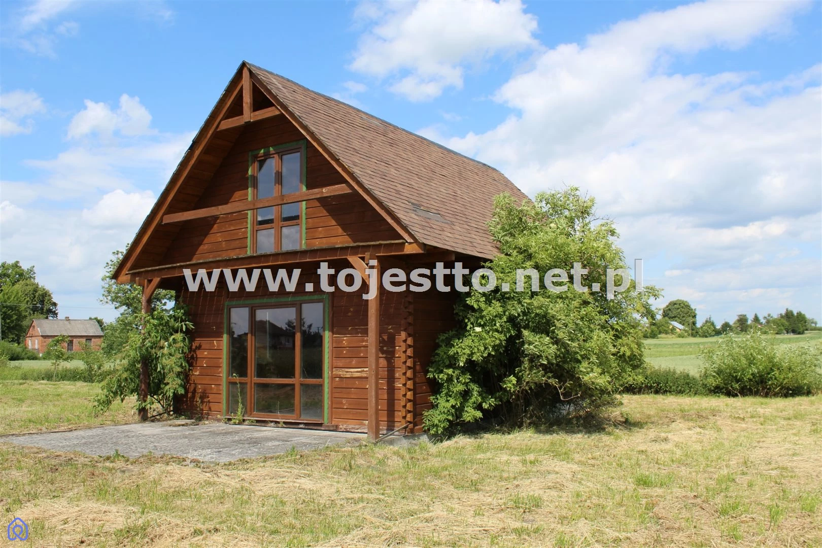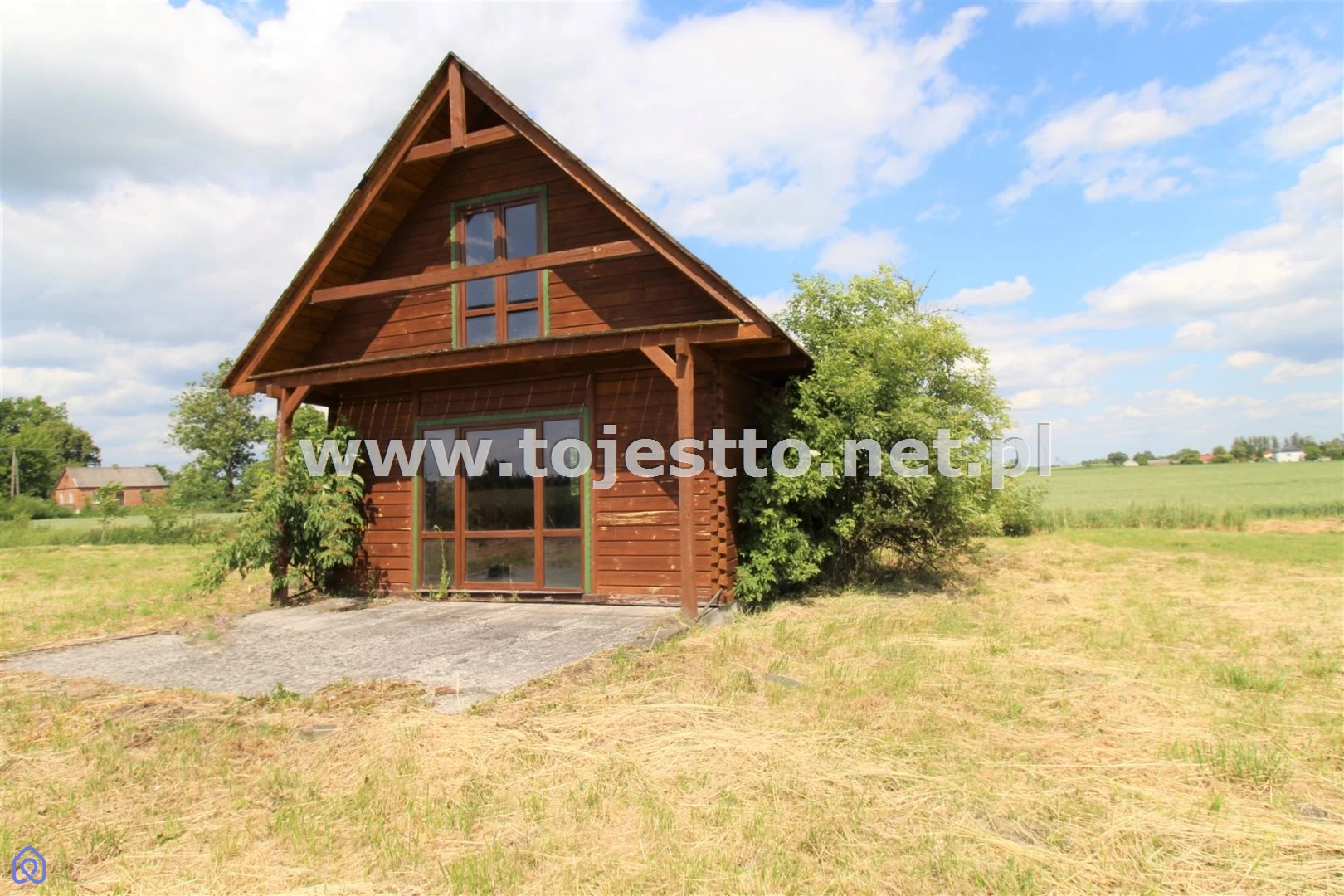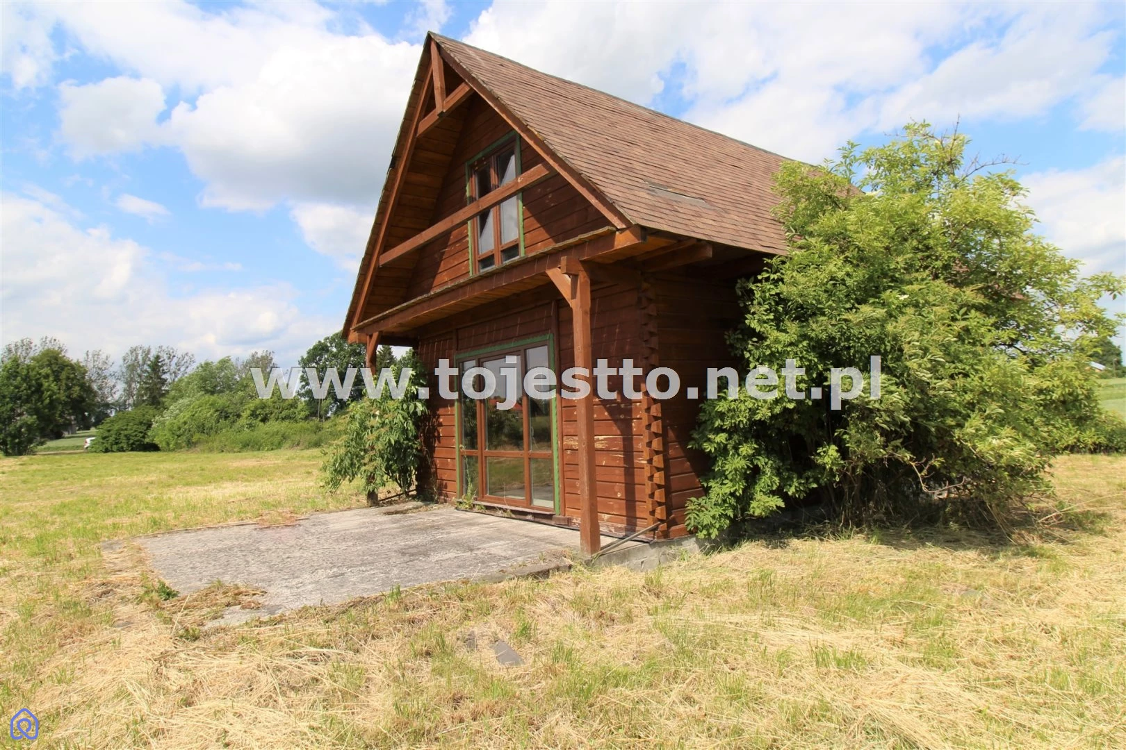 oferuje na sprzedaż drewniany parterowy domek z użytkowym poddaszem w stanie surowym zamkniętym na działce o powierzchni 2500m2
