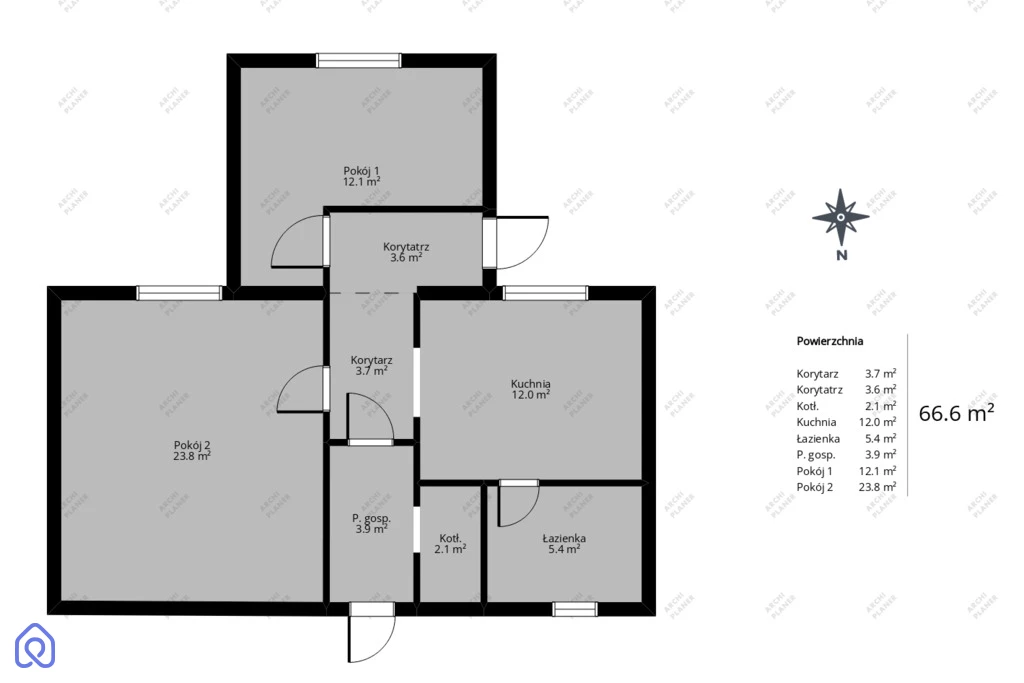 Parter budynku jest zagospodarowany, składa się z 2 pokoi, kuchni, łazienki, korytarza oraz kotłowni z pomieszczeniem gospodarczym.