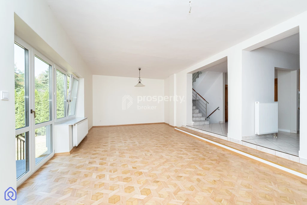 - salon 34.8 m2 z wyjściem na taras i ogród. Na podłodze parkiet w idealnym stanie