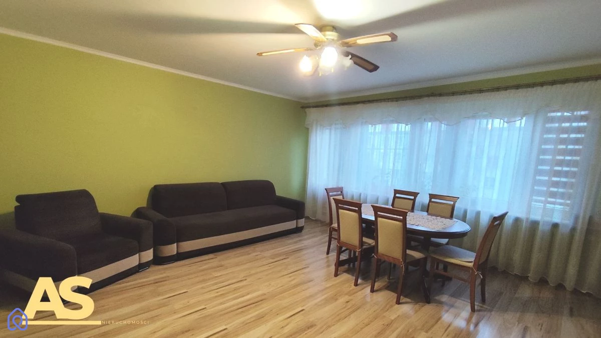 Lokal jest w pełni wyposażony. W salonie drewniane meble, stół z krzesłami oraz sofa i fotel.