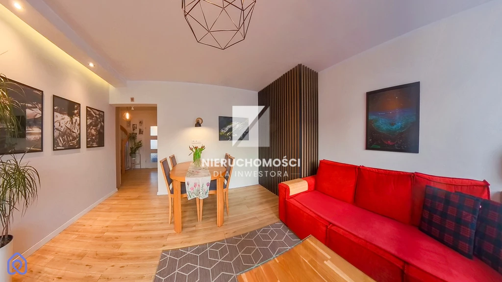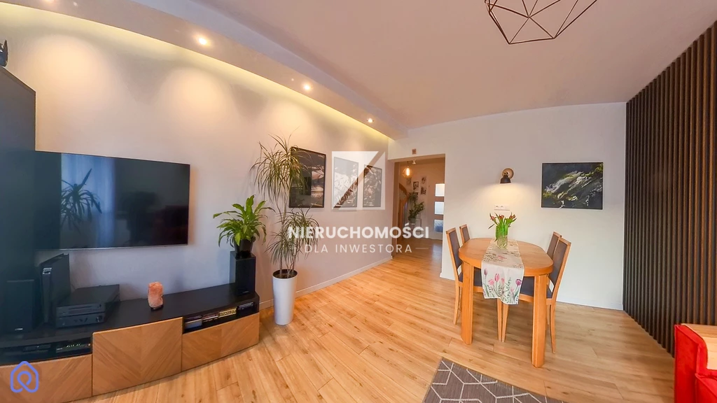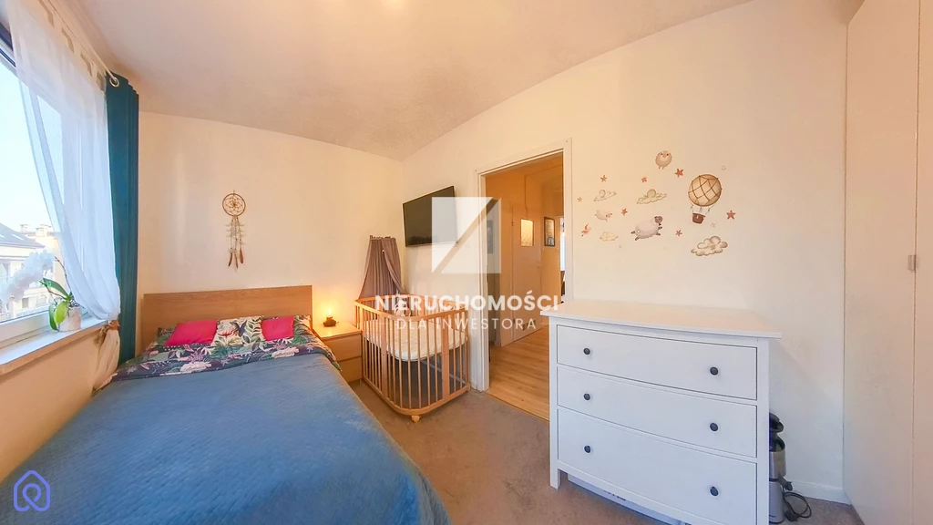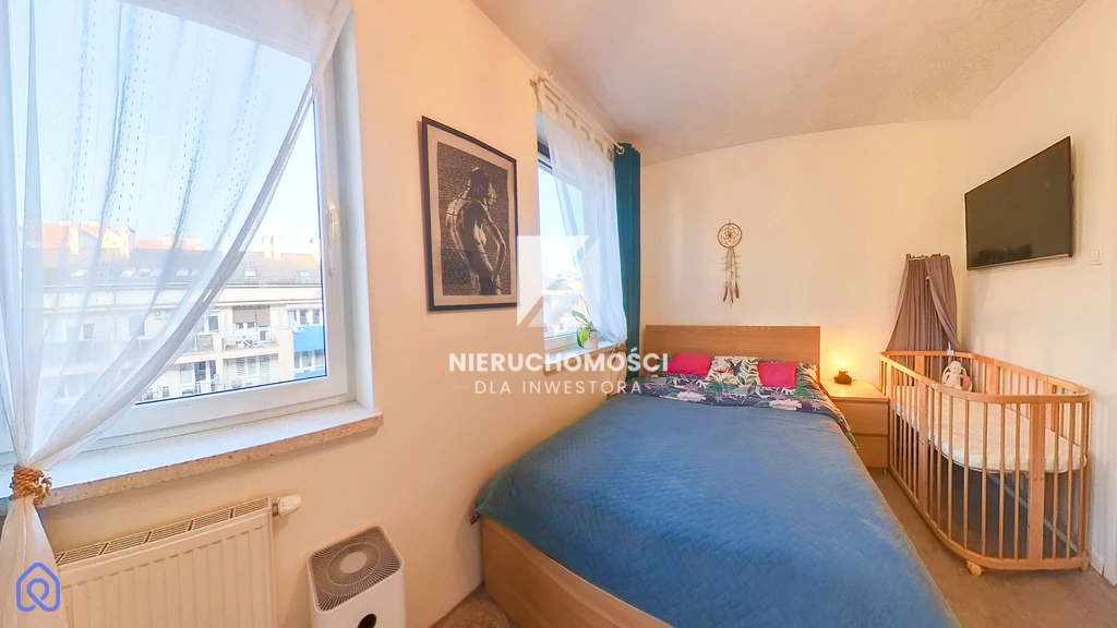 Na drugim poziomie znajduje się zaadaptowane poddasze, które funkcjonuje jako niezależne mieszkanie. W jego skład wchodzą dwa przestronne pokoje, aneks kuchenny oraz łazienka. Powierzchnia podłogi poddasza wynosi 58,98 m², natomiast powierzchnia użytkowa, ze względu na skosy, to 44,73 m². Jasne i przestronne wnętrze z czterema oknami dachowymi nadaje mu unikalnego charakteru. Obszar dzienny łączy się z funkcjonalnym aneksem kuchennym, tworząc przytulną przestrzeń do życia. To idealne miejsce dla dorastających dzieci, dodatkowa strefa wypoczynku lub przestrzeń do pracy. Może również być wynajmowane, generując stały dochód dla właściciela. Ponadto do mieszkania przynależą 2 piwnice o powierzchni 2,16 mkw i 2,11 mkw.