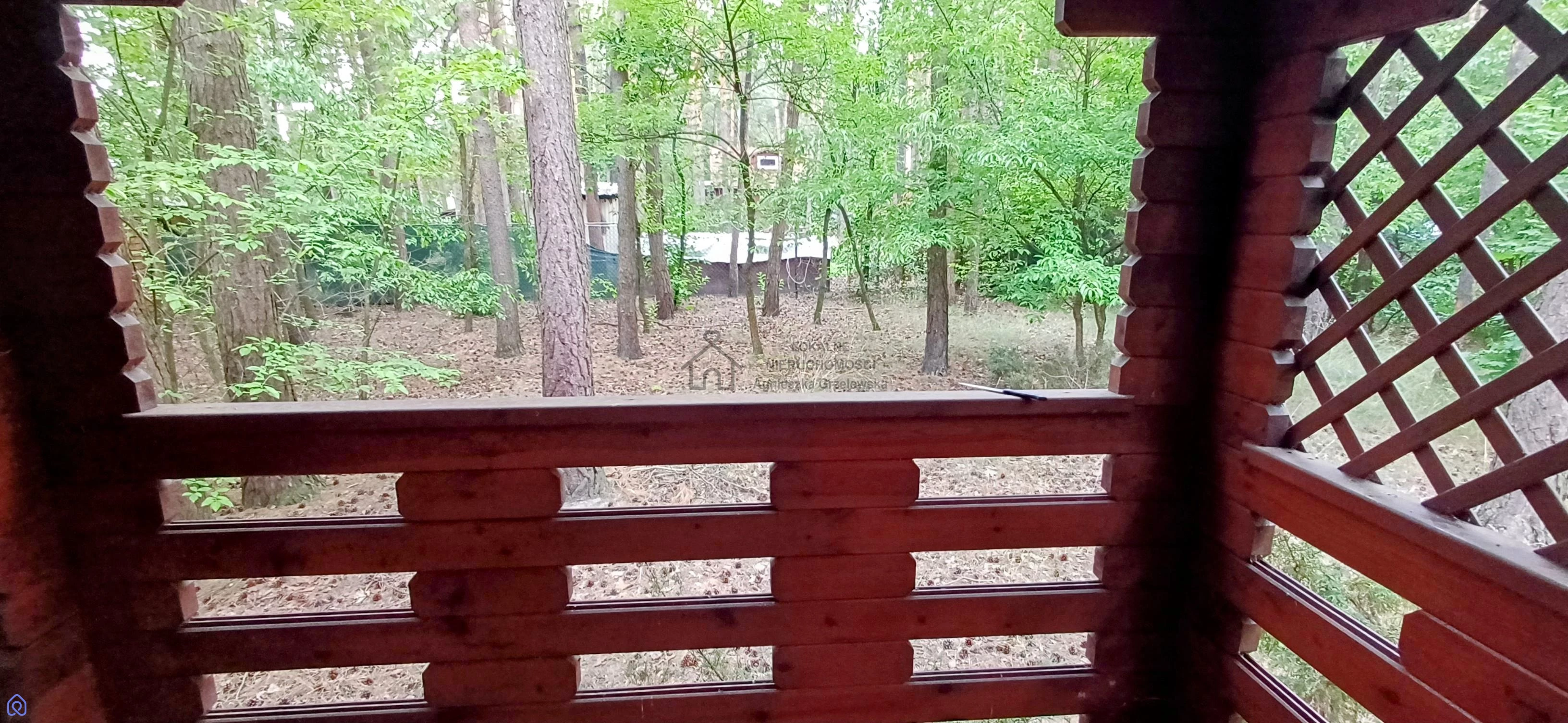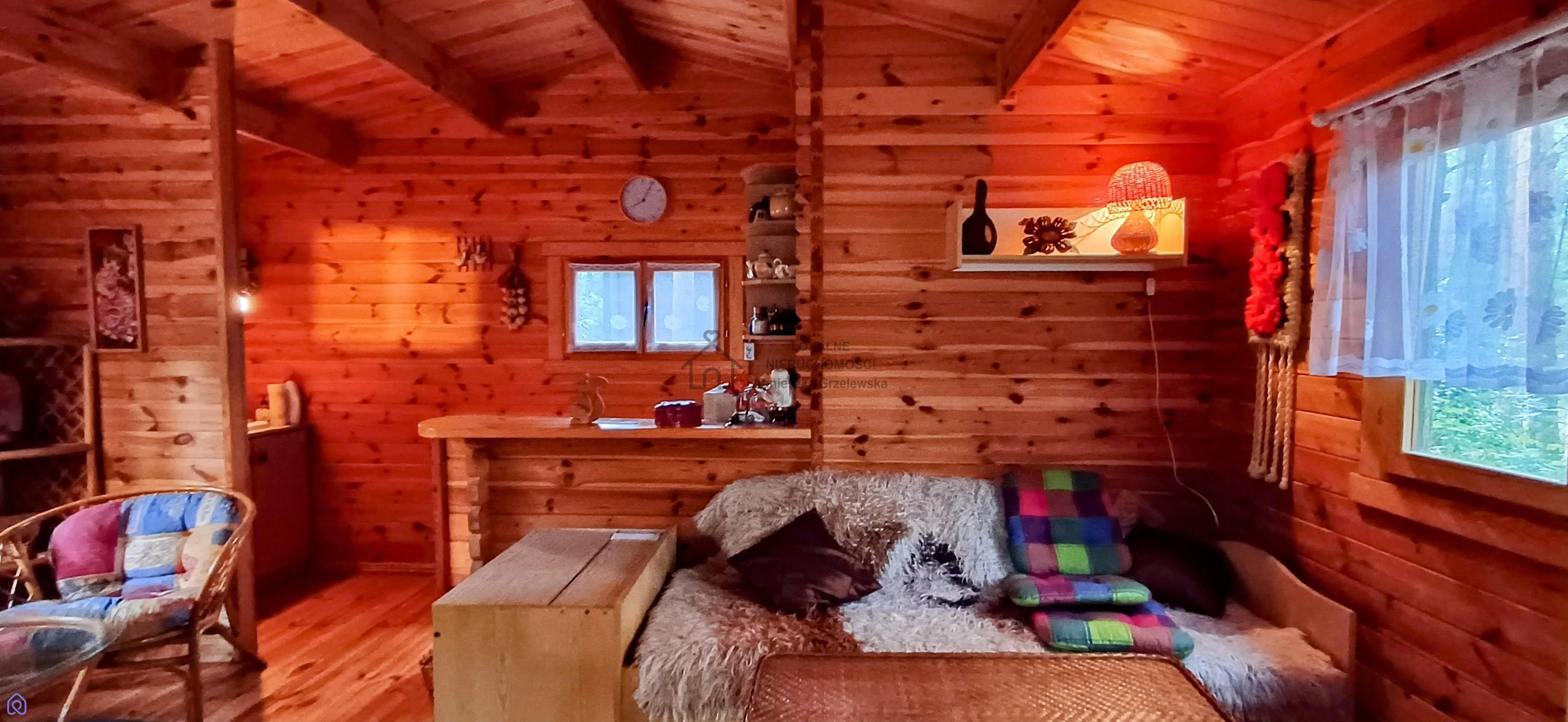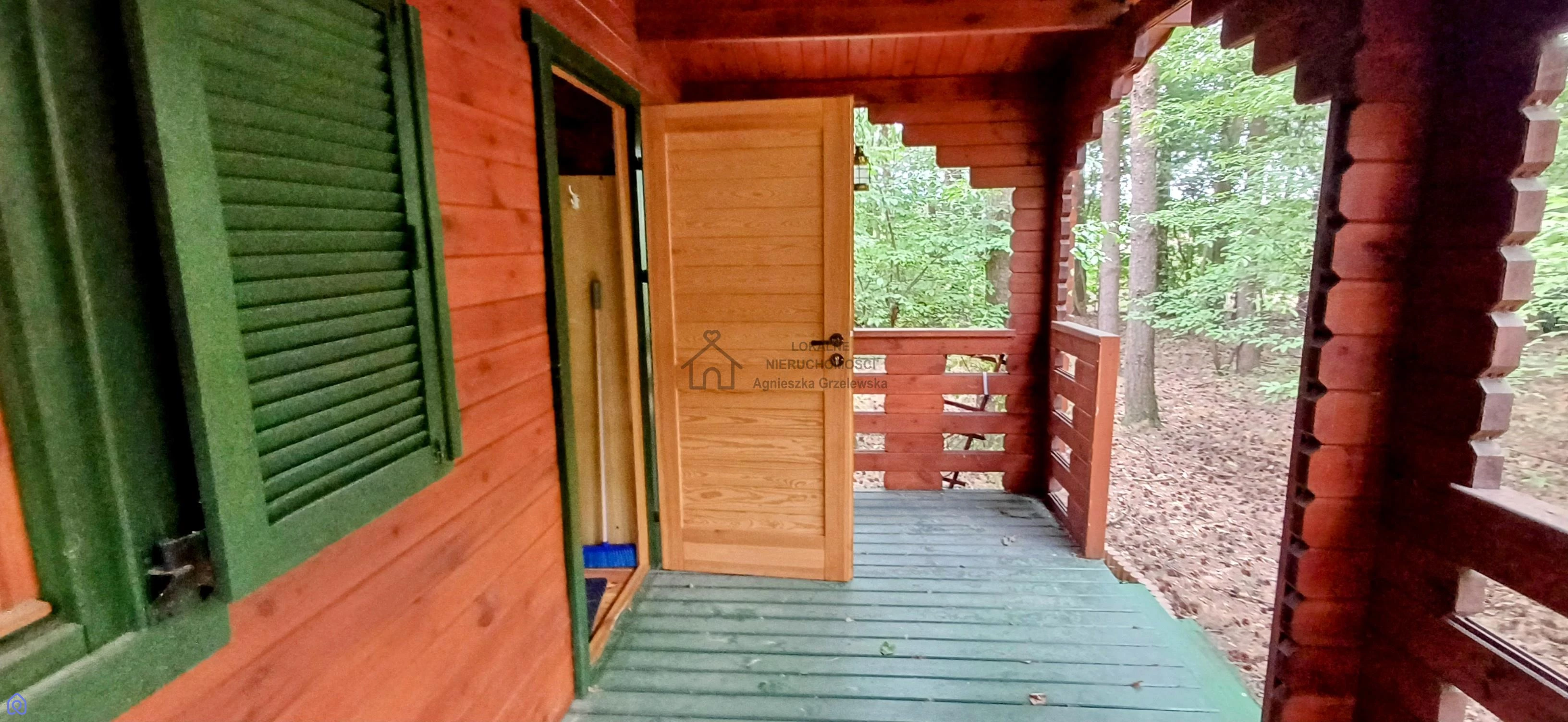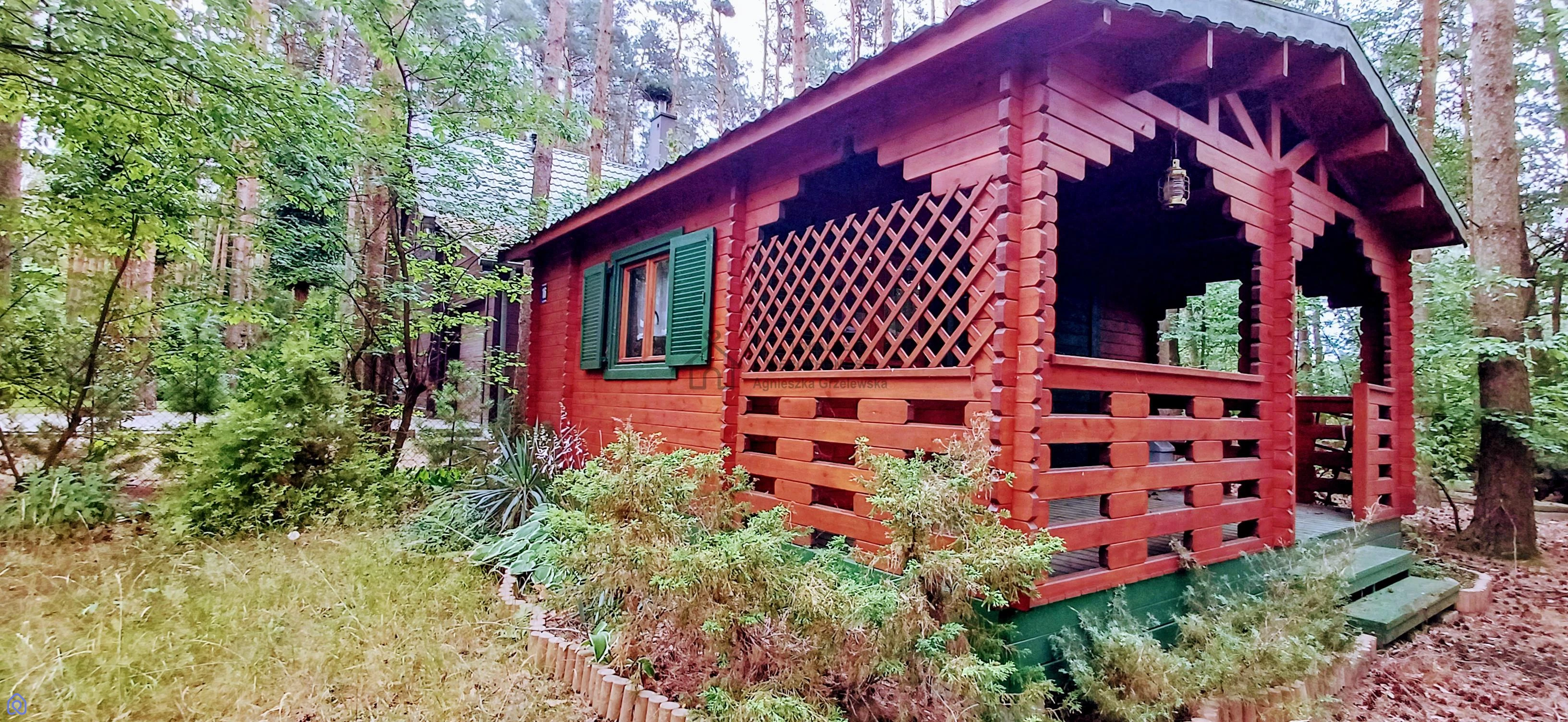 na działce znajduje się drewniany domek letniskowy świetna baza wypoczynkowa już od pierwszego dnia, posiadający przestronny pokój z wydzielonym aneksem kuchennym oraz zadaszoną werandą od frontu,