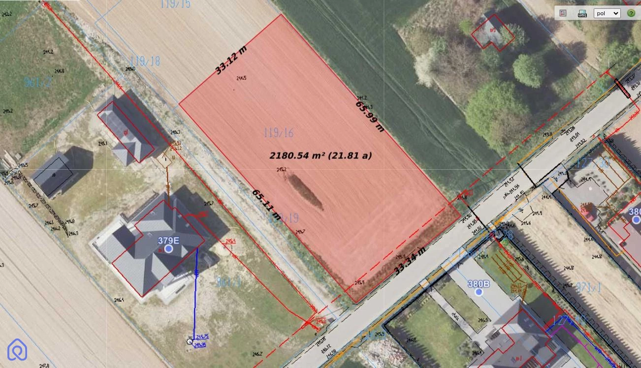DODATKOWE INFORMACJE: Typ własności: własność Kanalizacja: szambo Prąd: na działce Woda: studnia Kształt działki: prostokąt Długość działki: 65 Szerokość działki: 33,5 Typ drogi: asfaltowa Typ ulicy: osiedlowa Typ działki: budowlana