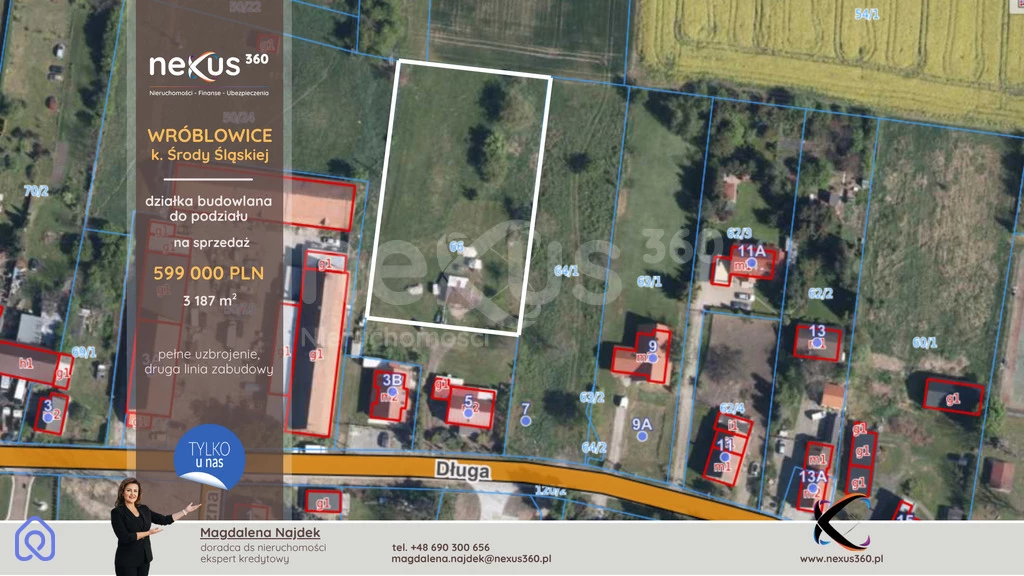 Działka w drugiej linii zabudowy z możliwością podziału na 4 mniejsze działki pod zabudowę jednorodzinną w miejscowości Wróblowice - bardzo dobrze skomunikowanej z Wrocławiem.