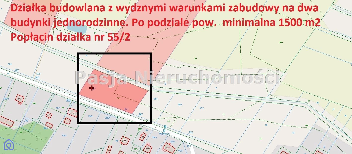 Wydane warunki zabudowy na budowę budynku mieszkalnego jednorodzinnegoMinimalna powierzchnia działki 1500 m2Media w drodze takie jak : woda, prąd, kanalizacja, światłowódPołożone są przy drodze krajowej 62 - dojazd bezpośrednio drogą asfaltowąDziałka przed podziałem geodezyjnym, numer ewidencyjny 55/2 Popłacin, więc możliwość zakupu jako:- całość z możliwością postawienia dwóch domów – 3800 m2, cena do negocjacji- działka o pow. 1900 m2 – cena 80 zł / m2- minimalna działka 1500 m2 – cena 85 zł/m2Działki znajdują się w pobliżu lasu i jezior, Wisły. Do granicy Płocka 3 km. Blisko sklepy Lidl, Biedronka, Pepco, Kik, stacje paliw.Zapraszam do współpracyPasja NieruchomościTel. 692 264 840Pasja Nieruchomości