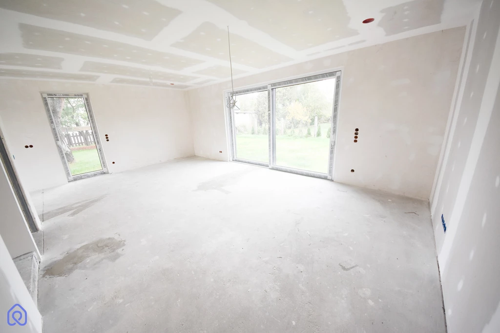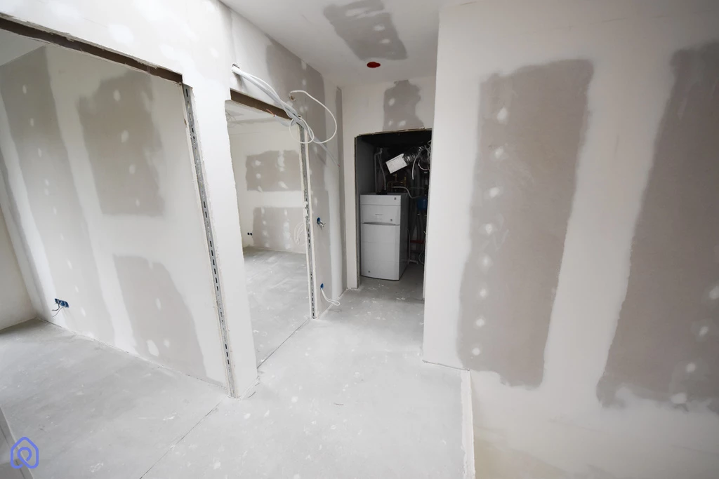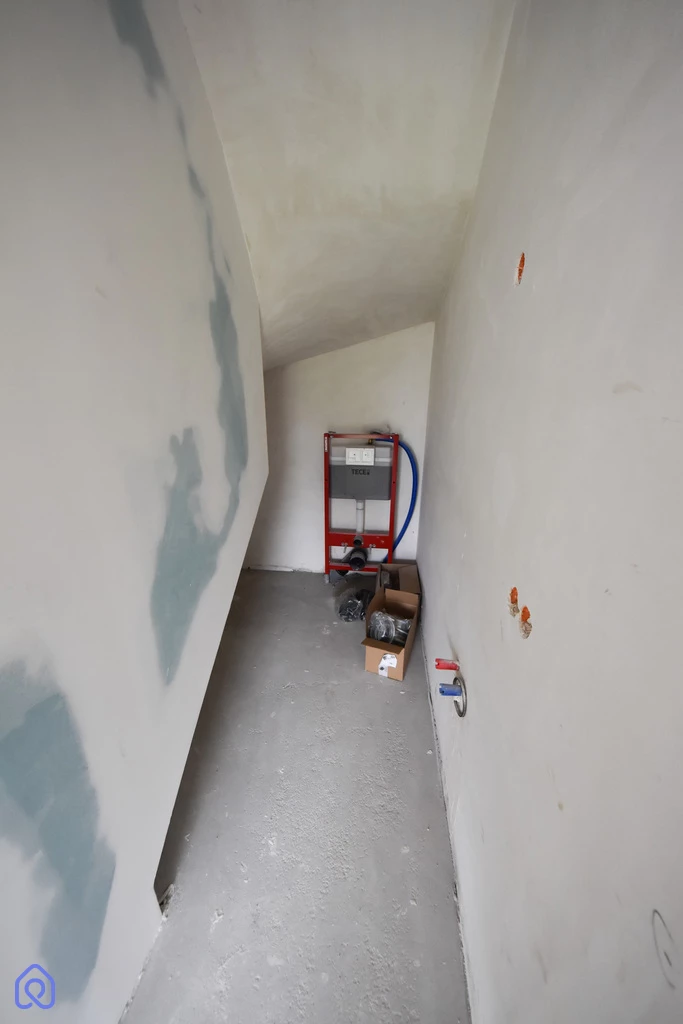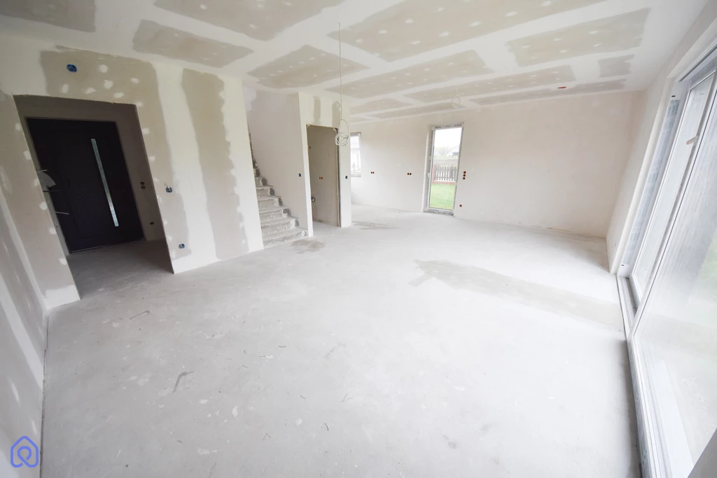 Przestronny salon z aneksem kuchennym , toaleta z wnęką idealną na pralkę lub mały schowek gospodarczy, wiatrołap z miesjcem na zabudowę.