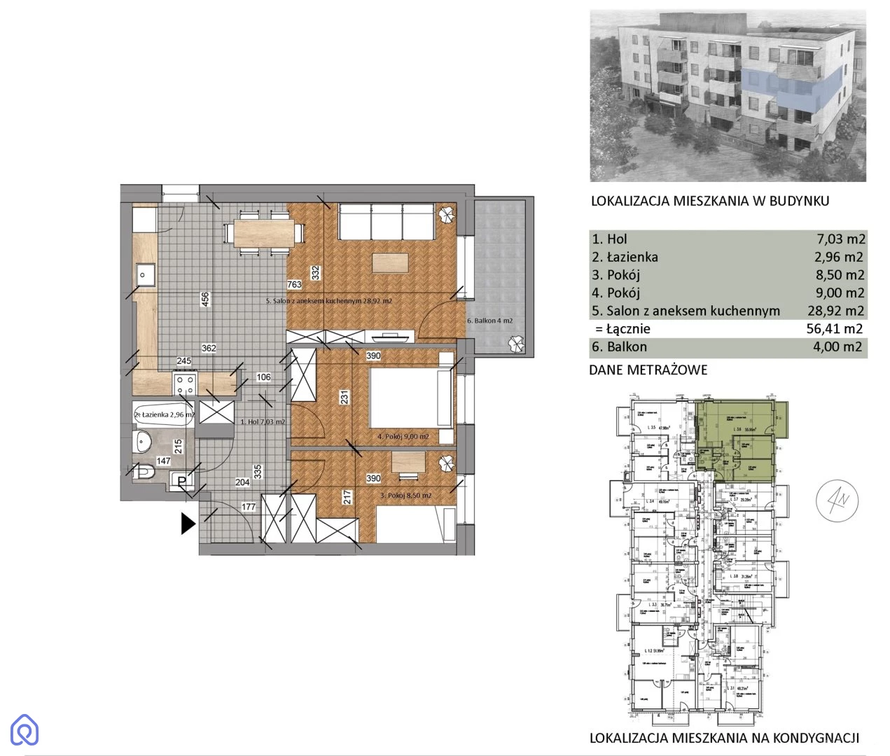 Powierzchnia mieszkania to 56,41m2, na którą składają się:salon z aneksem kuchennym 28,92m2dwie sypialnie (9,00m2 i 8,50m2)łazienka z wc 2,96m2przedpokój 7,03m2dodatkową powierzchnią jest balkon 4m2DODATKOWE INFORMACJE:stan deweloperski lub wykończone pod klucz - cena wykończonego pod klucz 590 000 zł (specyfikacja wykończenia dostępna u Doradcy, mieszkanie wykończone zgodnie z preferencjami kupującego)blokiem zarządza wspólnota mieszkaniowadostępna jest w ogólnodostępna wózkownia/rowerownia na parterzena terenie bloku dostępny jest plac zabaw tylko dla mieszkańcóww bloku zamontowany jest wideodomofon podnoszący bezpieczeństwo i komfort mieszkańcówteren bloku częściowo ogrodzonyistnieje możliwość dokupienia miejsca postojowego w garażu podziemnym - cena 40 000 zł lub zewnętrznego miejsca pod wiatą w cenie 15 000 zł Kupujący nie płaci podatku PCC 2%.