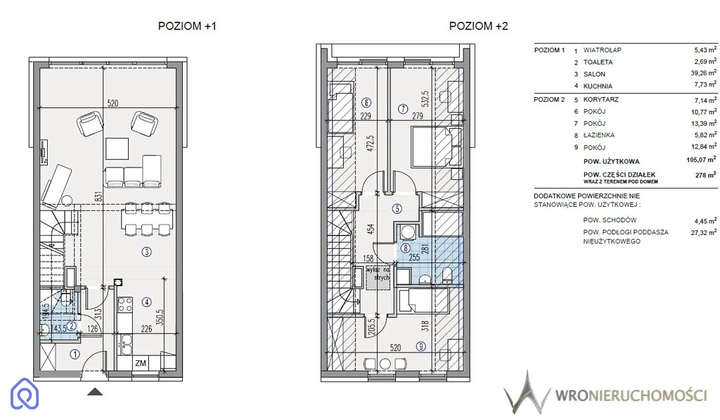Do domu przynależy ogród, dwa miejsca postojowe przed domem oraz poddasze nieużytkowe o powierzchni 38,55 mkw..