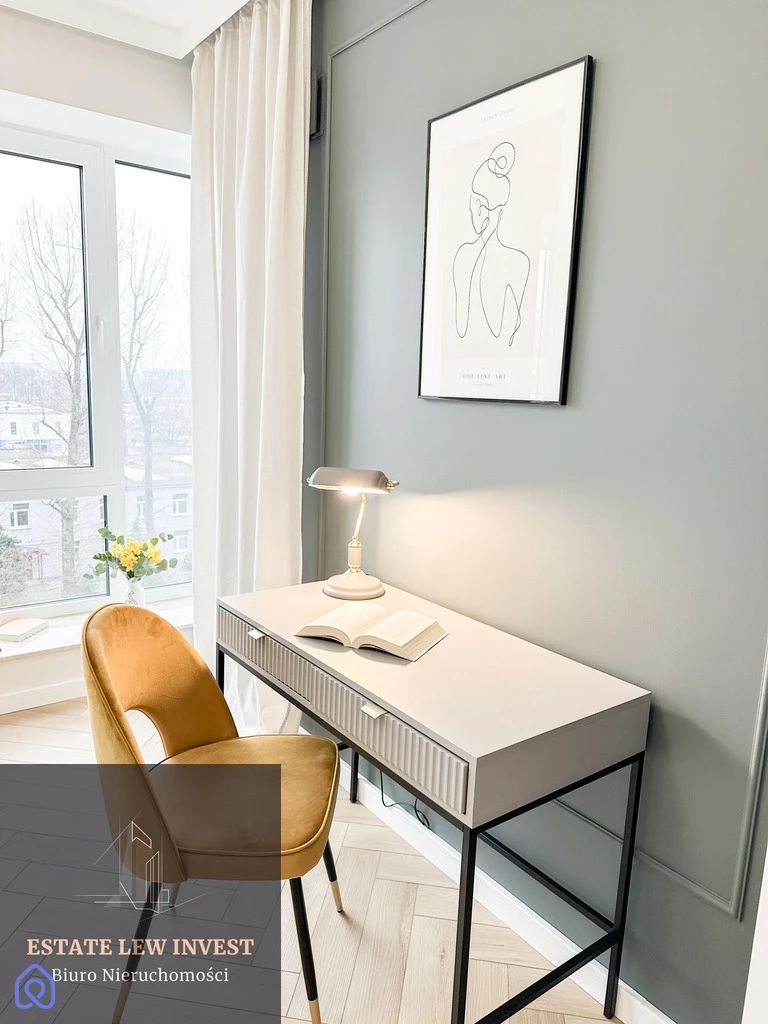 • Sypialnia z miejscem do pracy – przy oknie znajduje się stylowe biurko z wygodnym aksamitnym krzesłem w odcieniu miodowym, idealne do pracy lub nauki w naturalnym świetle.