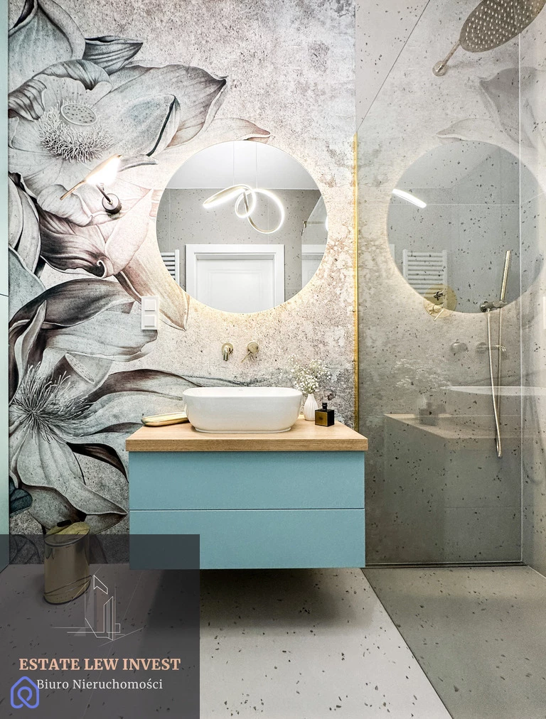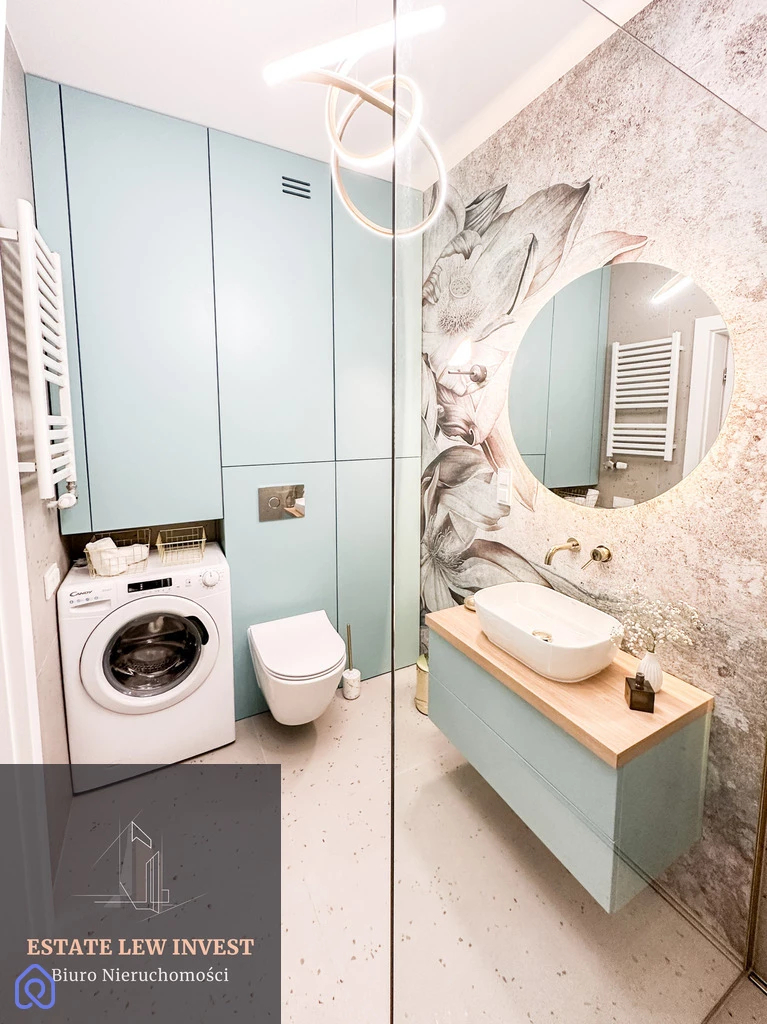 Wyposażona w pralkę i liczne szafki, które oferują wygodne miejsce do przechowywania kosmetyków i akcesoriów.