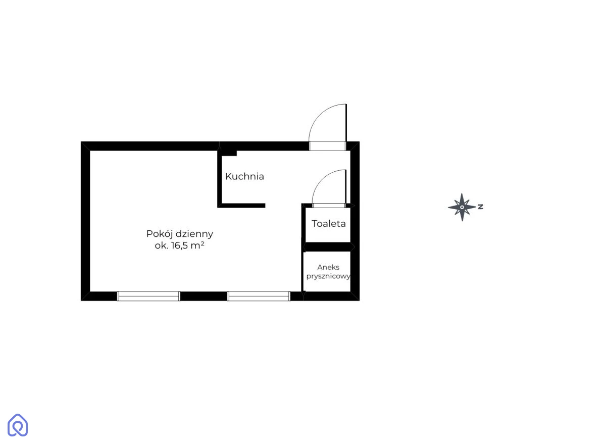 ♦ Pomieszczenie kuchenne - aktualnie wydzielone jako osobna przestrzeń robocza. Można pozostawić jako kuchnię zamkniętą lub otworzyć ją na pokój, tworząc spójne, wizualnie większe studio.