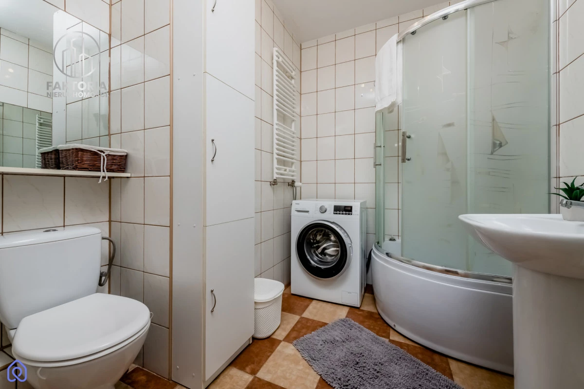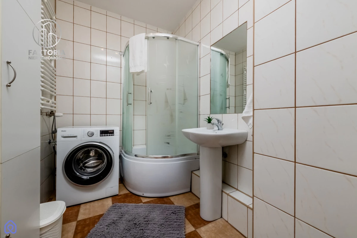 - duża łazienka wyposażona w kabinę prysznicową (na wyposażeniu pozostaje również pralka);
