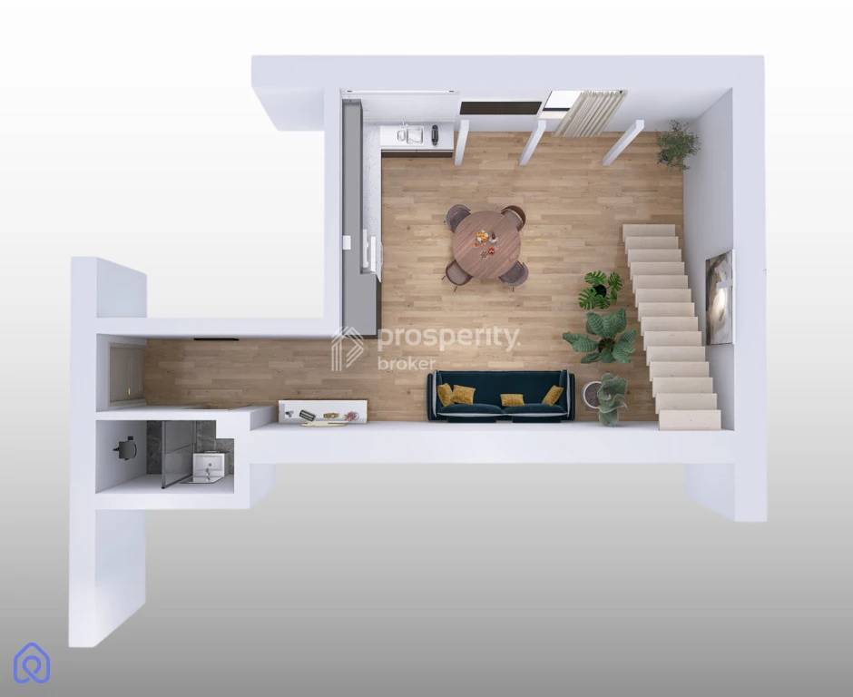 - jasny pokój dzienny z funkcjonalnym aneksem kuchennym,
