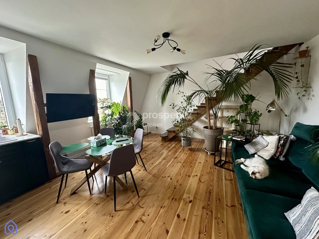 Dodatkowym, ogromnym atutem jest przylegający strych o powierzchni 25,34 m² (bez skosów), a łącznie aż 56,71 m² po podłodze, z wejściem bezpośrednio z mieszkania. Stanowi on idealną przestrzeń do adaptacji – może pełnić funkcję sypialni, biura, przestrzeni do pracy twórczej lub rekreacyjnej.