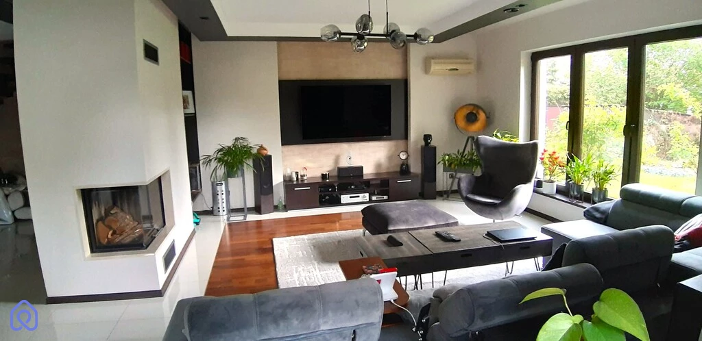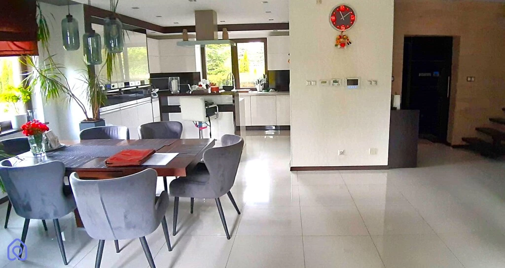 Z innych udogodnień czy przydatnych urządzeń w domu można jeszcze wymienić: taras ogrodowy zadaszony i sufitowym wentylatorem, wysokiej klasy fotel do masażu całego ciała firmy Cascada Zero, centralny odkurzacz, system uzdatniania wody, instalacje tv, sat i lan doprowadzone do każdego pokoju, kino domowe z ekranem 150 cali wysuwanym z sufitu, w garażu gniazdo do podłączenia ładowarki samochodu elektrycznego, kamery ze zdalnym monitoringiem i sterowaniem, wszystkie okna z automatycznymi roletami przeciwwłamaniowymi, rozkładany duży basen letni, traktorek ogrodowy i wiele innych urządzeń i wyposażenia.