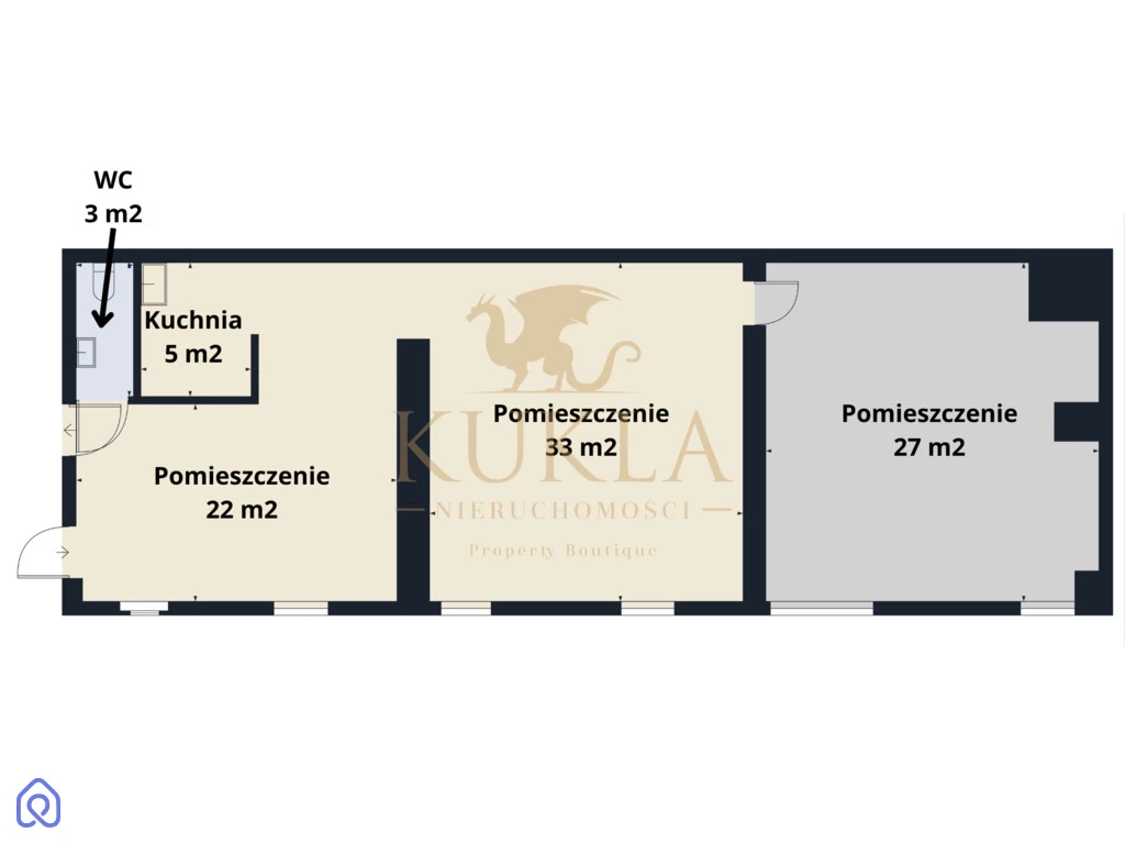 Nieruchomość: Lokal składa się z dwóch dużych przechodnich pomieszczeń, pokoju, łazienki i kuchni.
