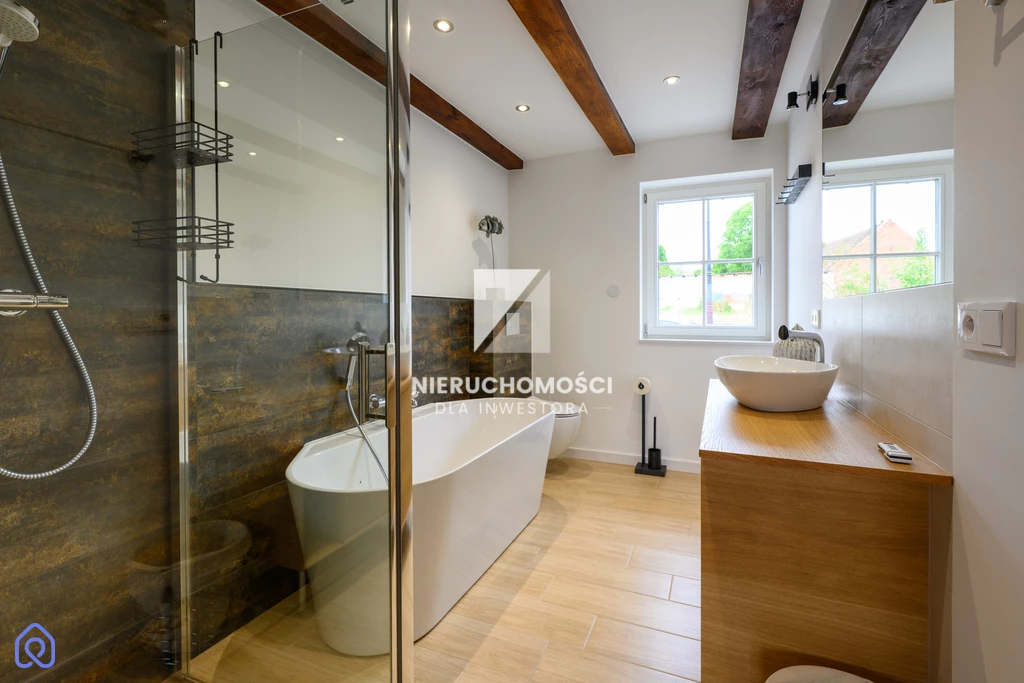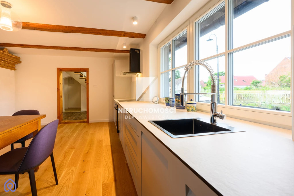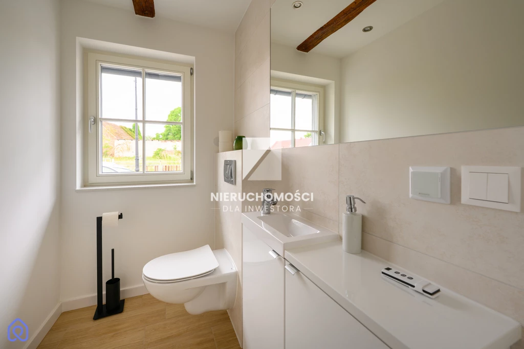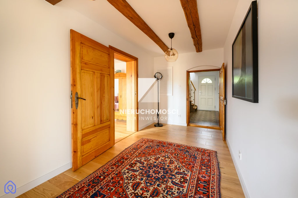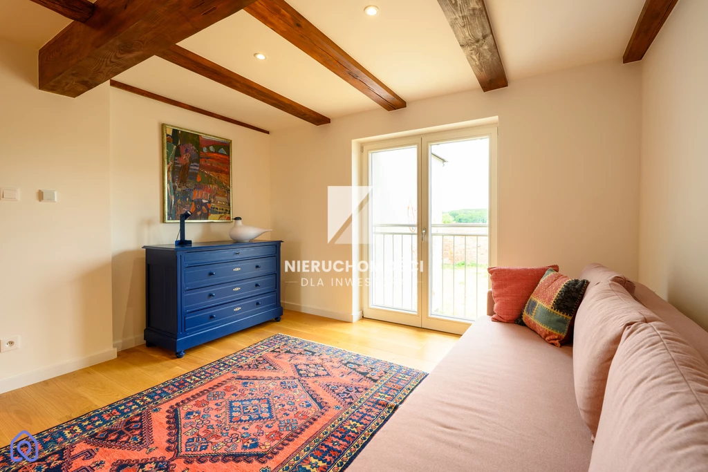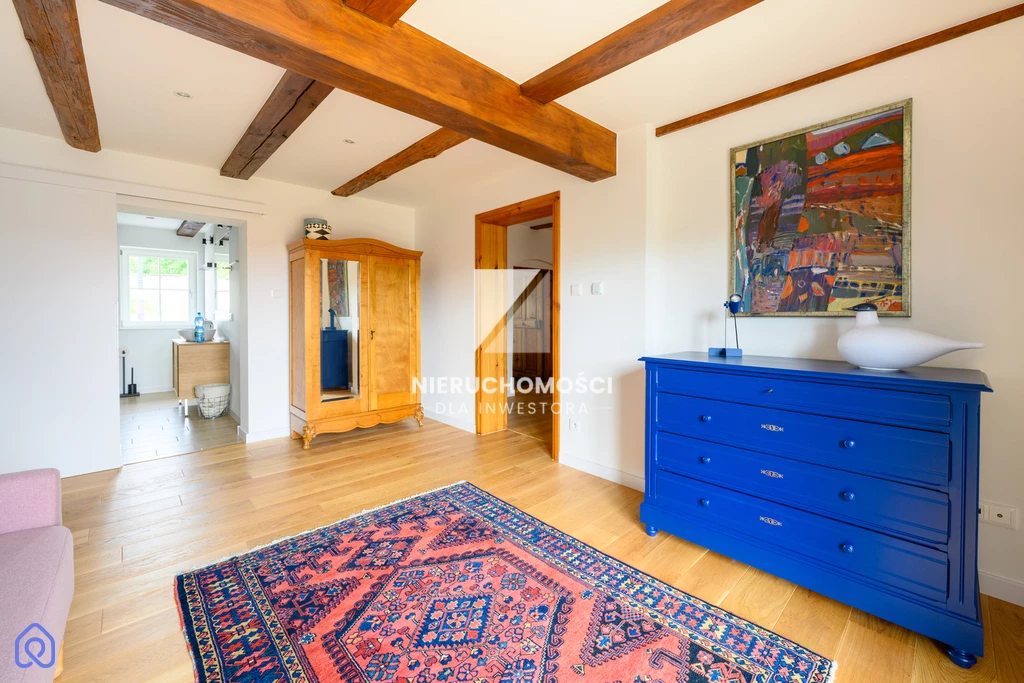 Remont przeprowadzono z szacunkiem – dla proporcji, materiału, światła. Nowy dach, elewacja, energooszczędne okna – ale zachowane oryginalne detale. Belki. Drzwi. Terakota w przedsionku, której nie da się już nigdzie kupić.