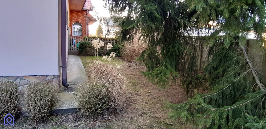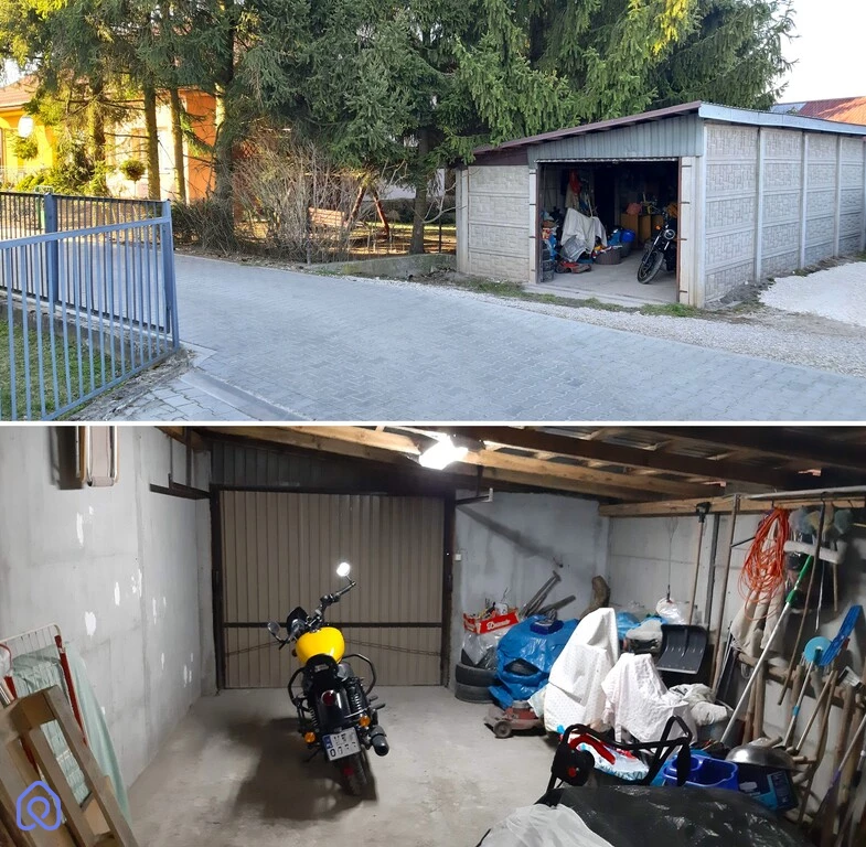 Na działce stoi sprzedawana połowa bliźniaka oraz duży, częściowo podpiwniczony (pod ok.1/3 powierzchni) garaż z płyt betonowych.