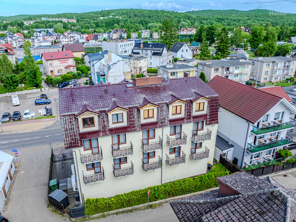 Budynek pięciokondygnacyjny mieszkaniowo- usługowy o powierzchni użytkowej części mieszkalnej około 630 m2 oraz powierzchni użytkowej części usługowej około 244 m2, posadowiony na ogrodzonej działce 484 m2.