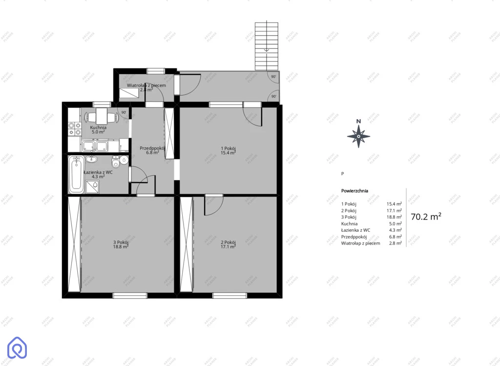 Ma 70,2 m.kw. powierzchni i składa się z następujących pomieszczeń: