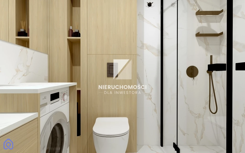 Nowoczesna łazienka, w której każdy detal został dopracowany. Wygodna zabudowa przy WC, pralka umieszczona w eleganckiej szafce oraz przestronny prysznic (120 x 80 cm) sprawiają, że codzienne obowiązki stają się przyjemniejsze.