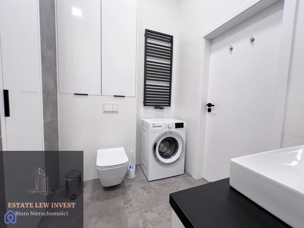 - łazienka wyposażona w wannę, pralkę oraz szafki do przechowywania