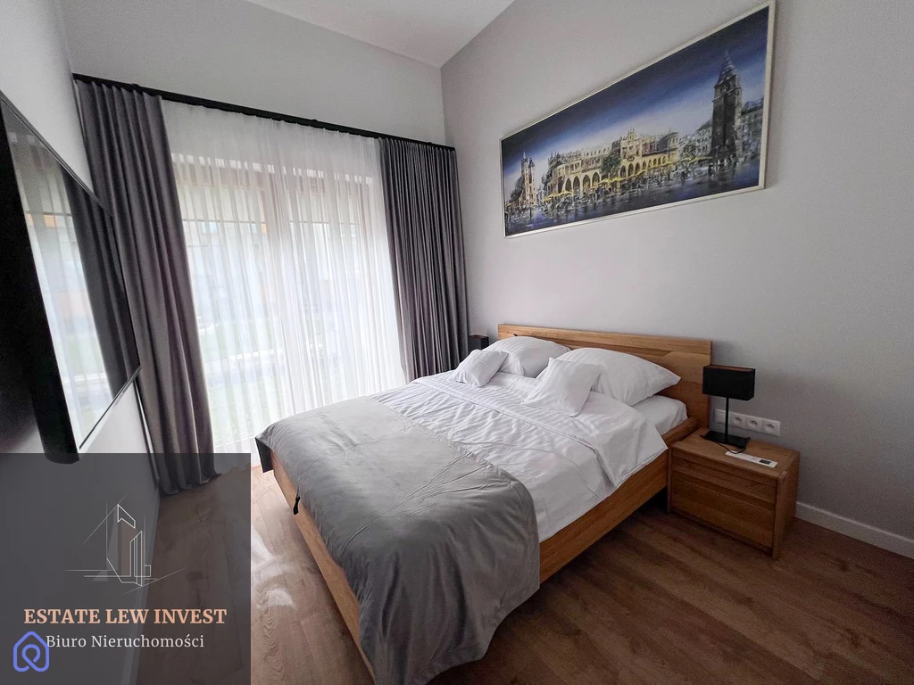 Całość wyposażenia: drobny sprzęt AGD (odkurzacz, żelazko, czajnik), deska do prasowania, suszarka na bieliznę, komplet garnków, zastawa stołowa oraz wyposażenie sypialni, wszystko jest nowe.