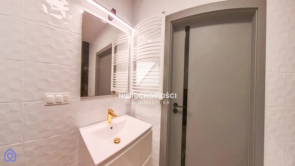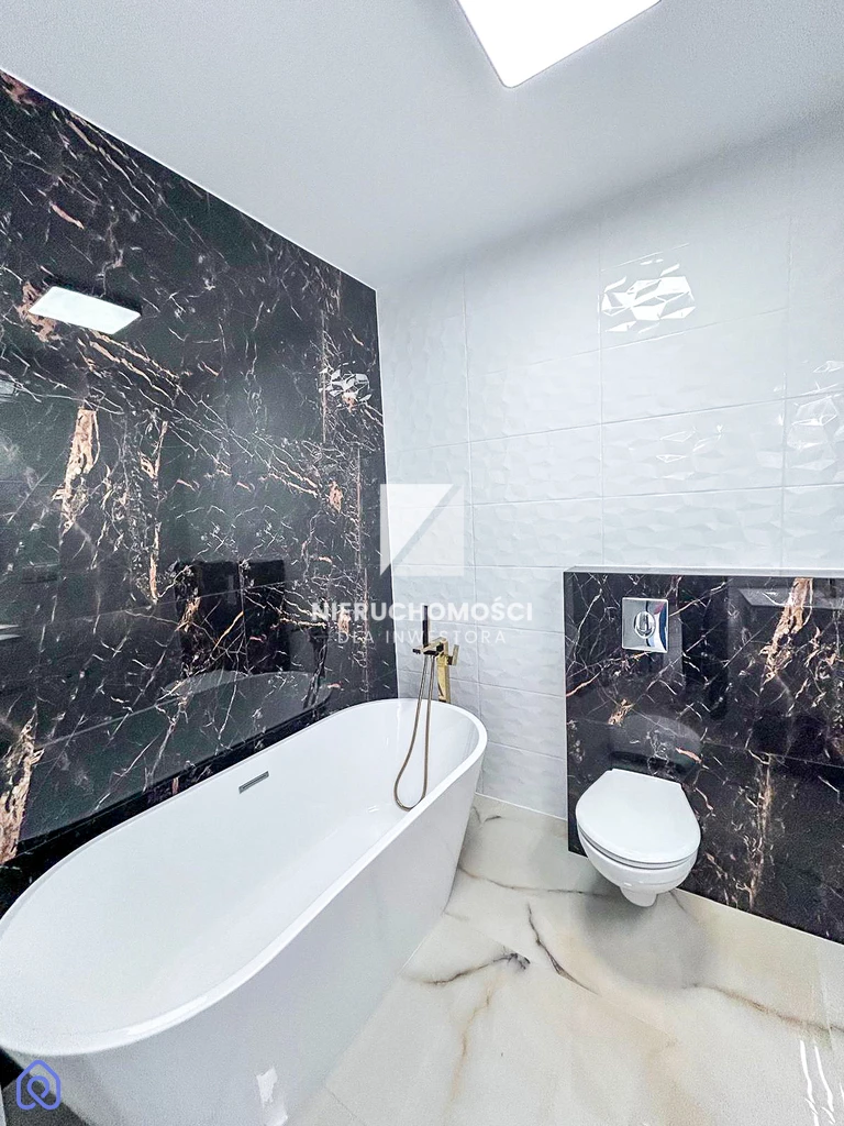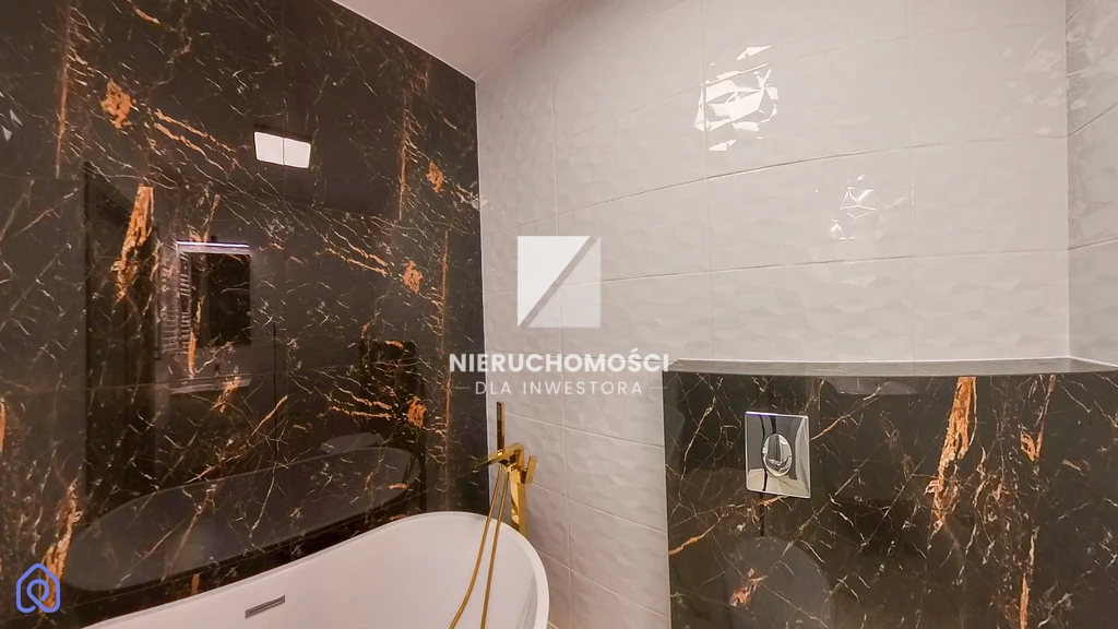 Łazienka została wykończona materiałami wysokiej klasy. Połączenie jasnych, strukturalnych kafli z ciemnym marmurem i złotą armaturą tworzy elegancką przestrzeń, która spełni oczekiwania najbardziej wymagających najemców. Wolnostojąca wanna zachęca do wieczornego relaksu.